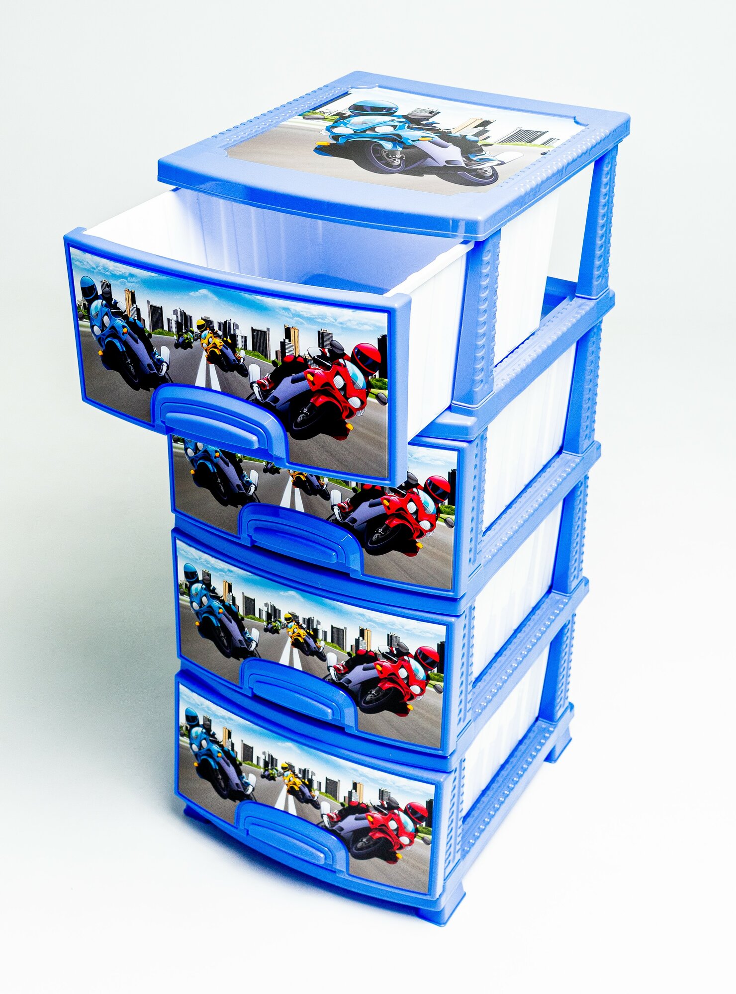 Купить Комод декор 4 ярус Мотокросс голубой В95*Ш38*Г47 с доставкой по всей России. Комод декор 4 ярус Мотокросс голубой В95*Ш38*Г47: сравнение цен, характеристики, фото, актуальное наличие и цены.
