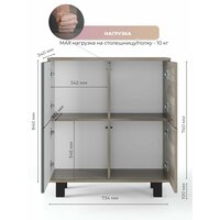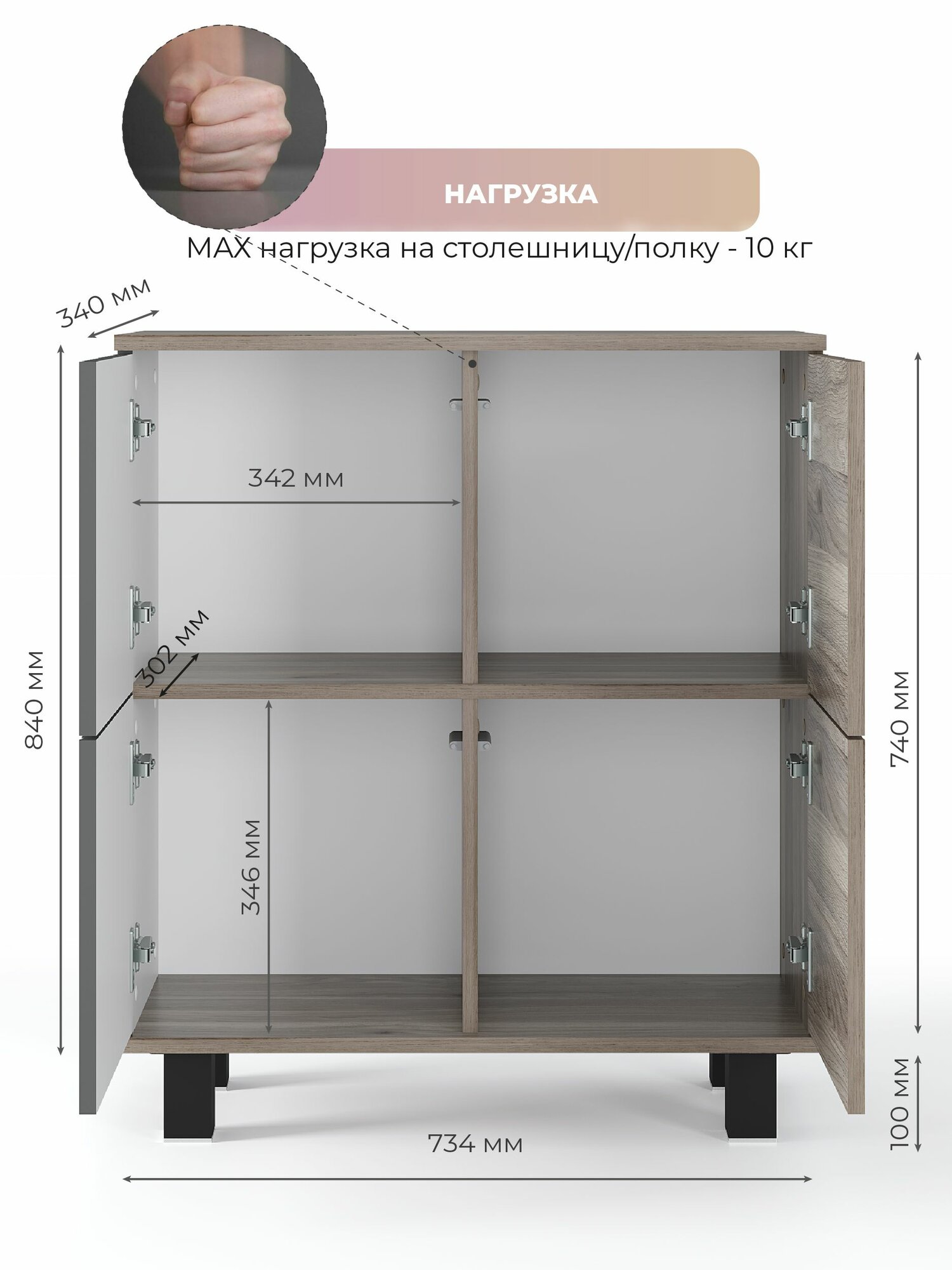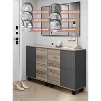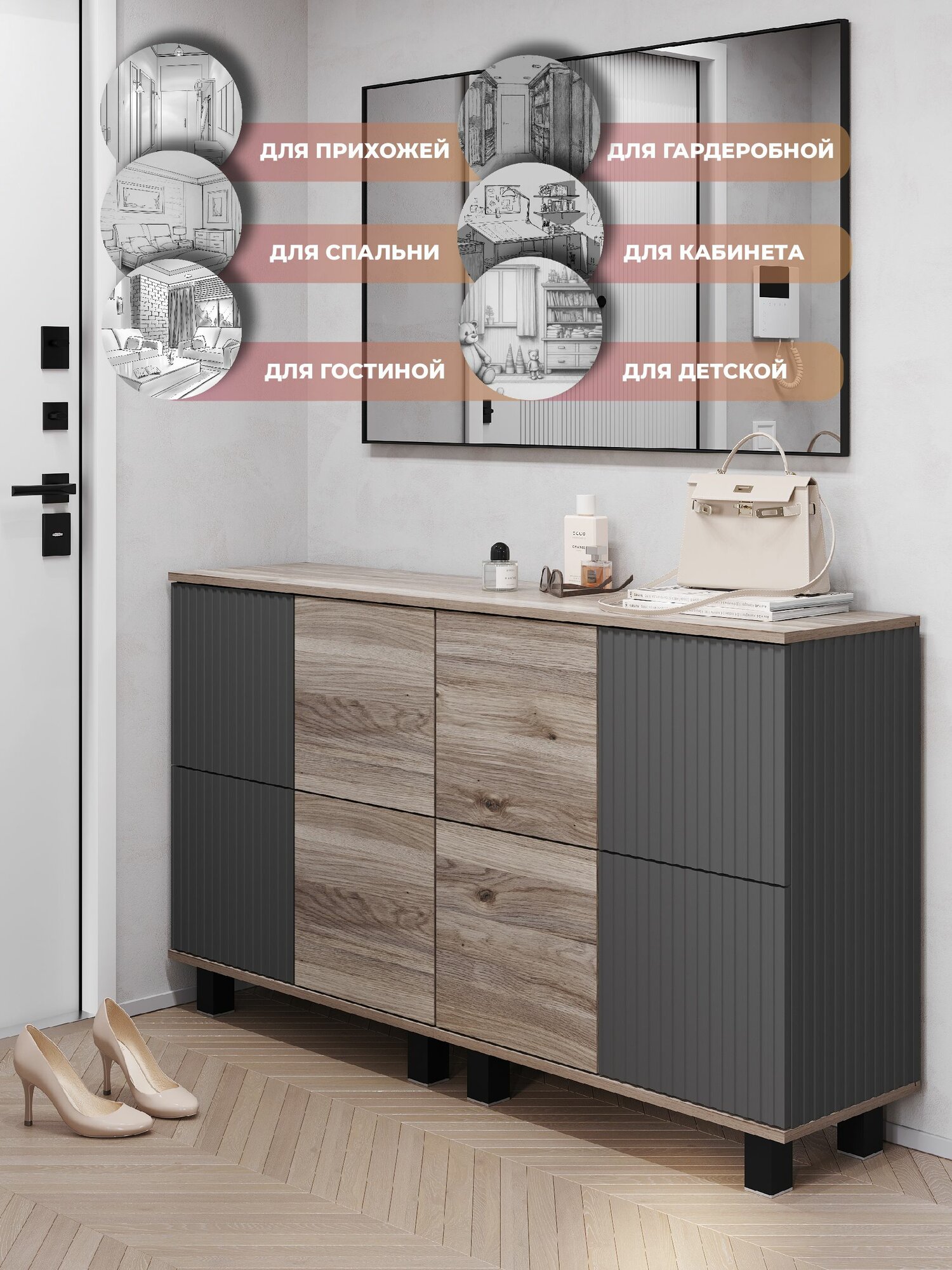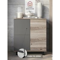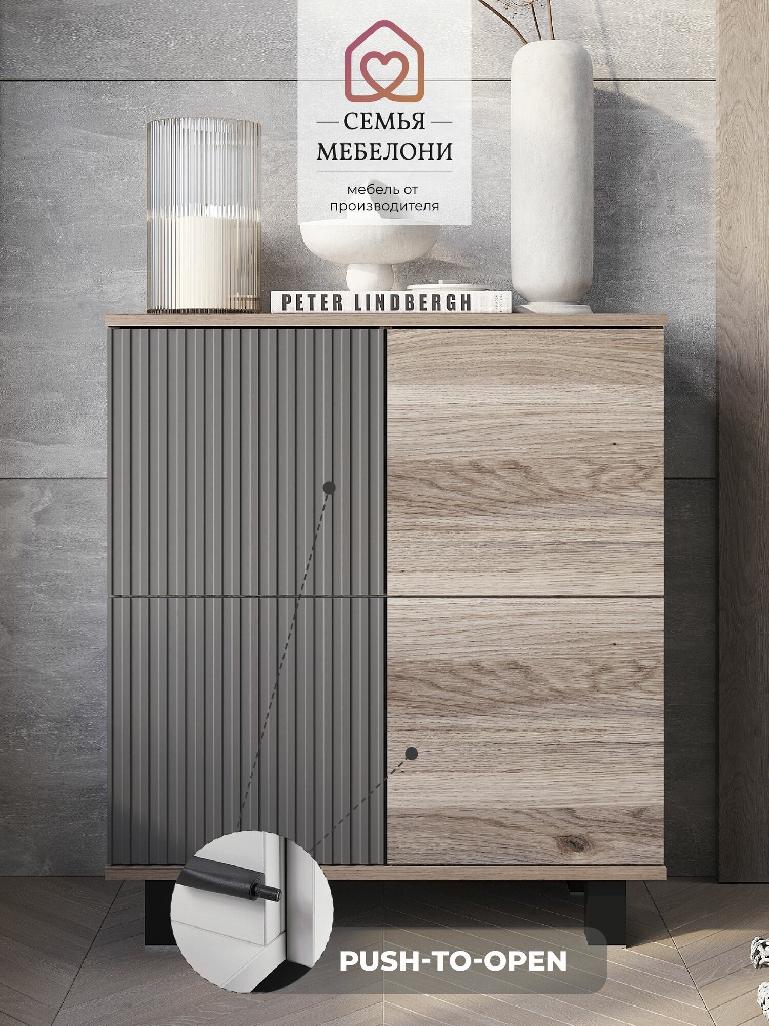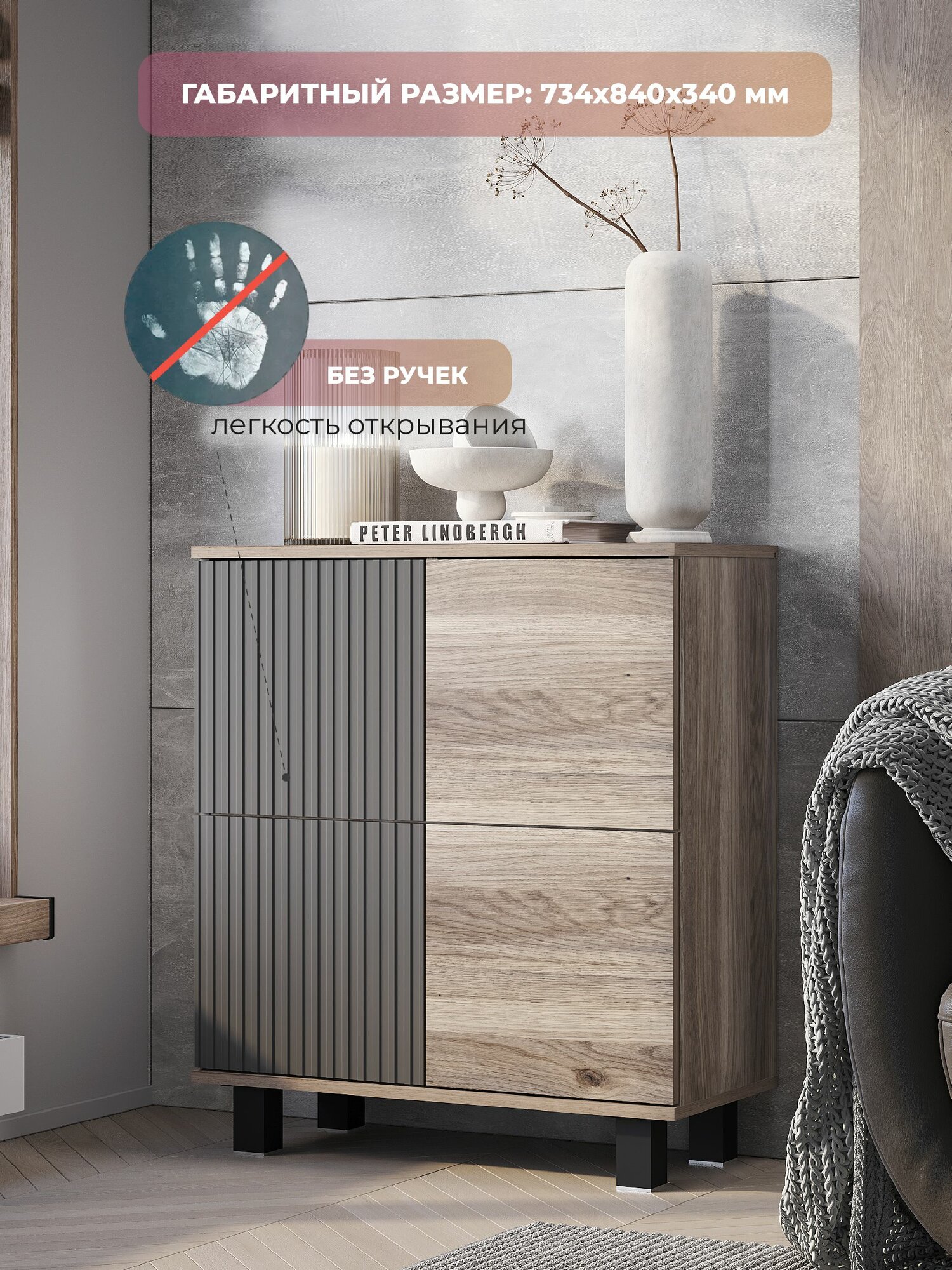 Эта модель подходит для использования в гостиной, кухне, коридоре и даже на балконе. Стильный дизайн с фрезеровкой отлично дополнит интерьеры в стиле лофт и модерн. Каждая дверца оборудована системой push to open, что обеспечивает легкость открывания.
