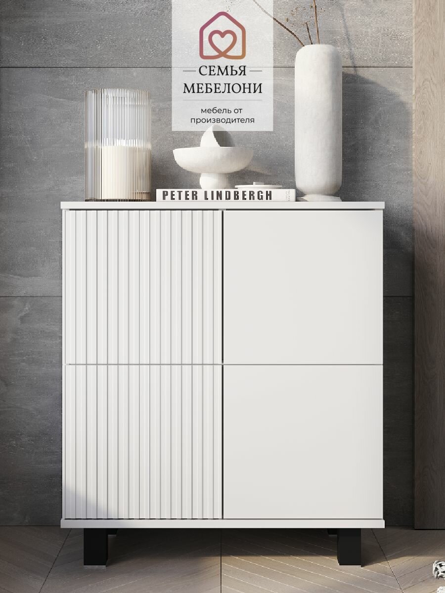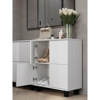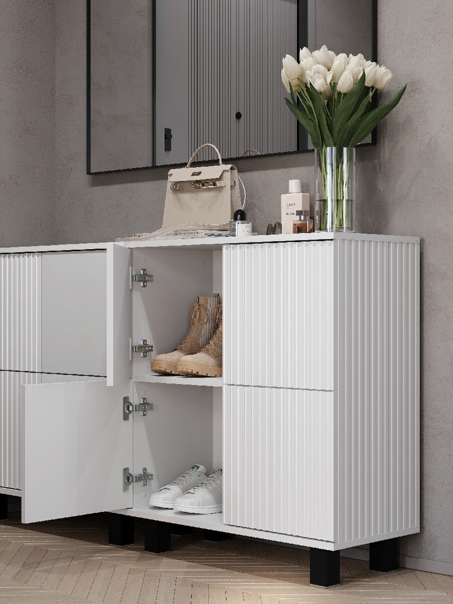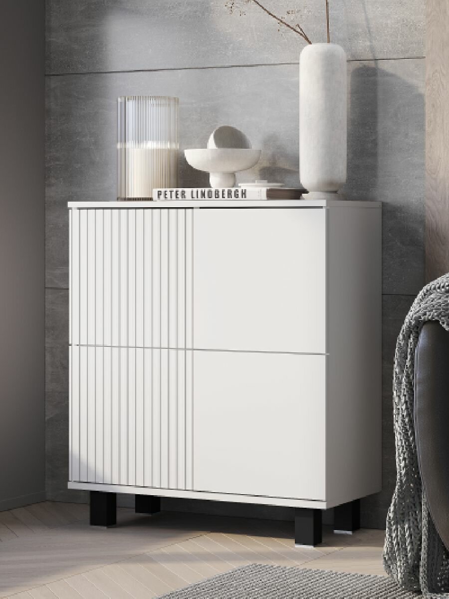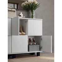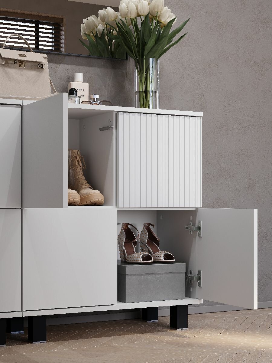 Эта модель подходит для использования в гостиной, кухне, коридоре и даже на балконе. Стильный дизайн с фрезеровкой отлично дополнит интерьеры в стиле лофт и модерн. Каждая дверца оборудована системой push to open, что обеспечивает легкость открывания.