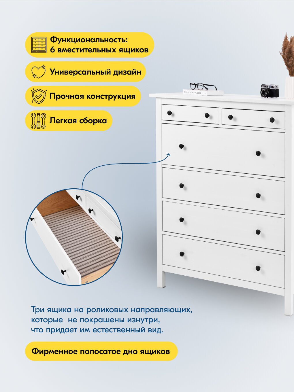 Организация пространства: 6 просторных ящика для удобного хранения и быстрого доступа к вашим вещам.