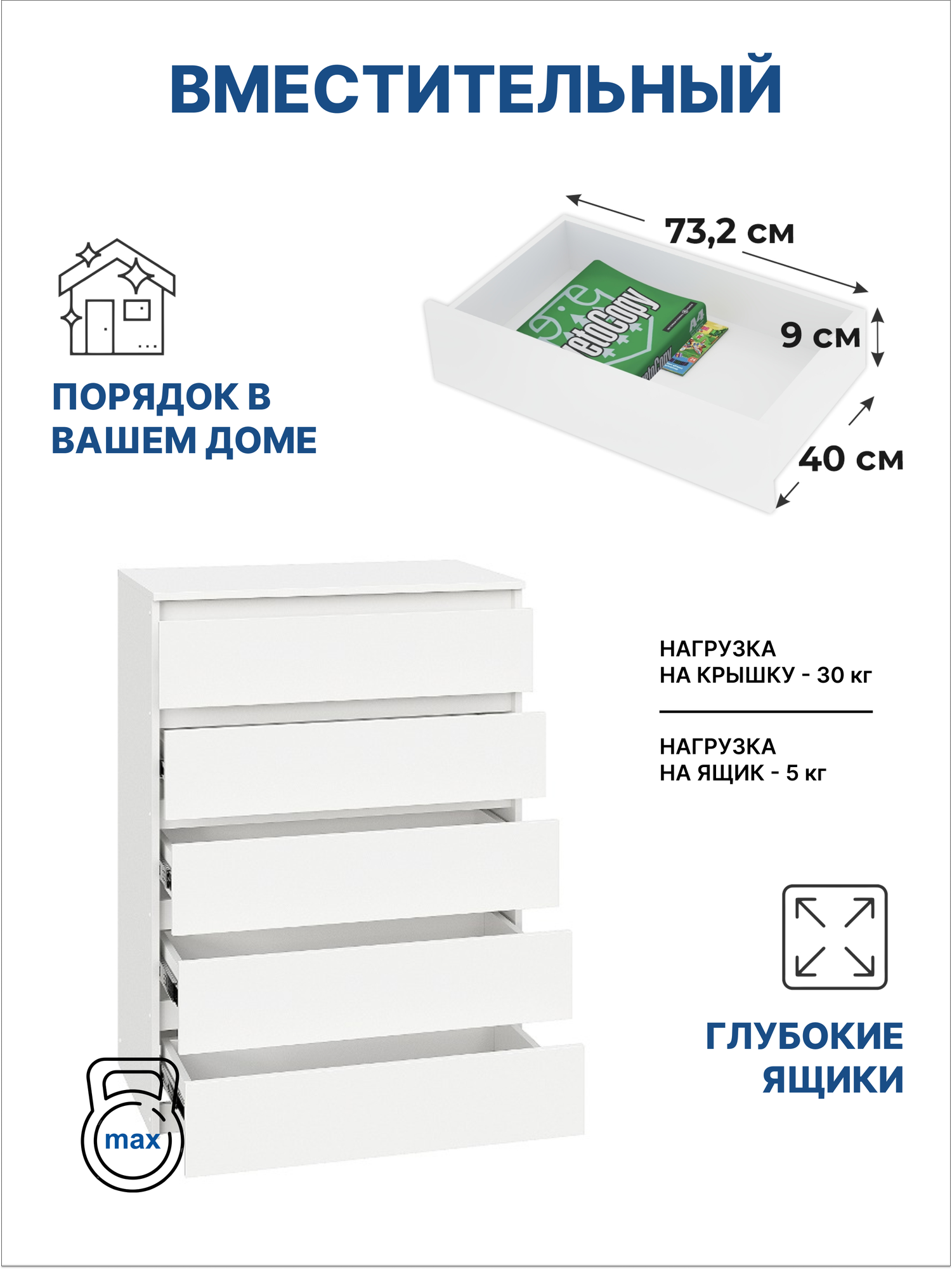 Почему стоит выбрать комод Эльбрус? Универсальность — подходит для спальни, детской, прихожей, кухни и даже маникюрного салона! Практичность — комод с ящиками обеспечивает удобное хранение одежды, игрушек, посуды или косметики. Стильный дизайн — деревянный комод в современном исполнении поможет создать интерьер в духе Pinterest. Надежность — изготовлен из качественных материалов с прочной фурнитурой. Простая сборка — понятная инструкция, как у Икеа, позволит быстро собрать комод деревянный.