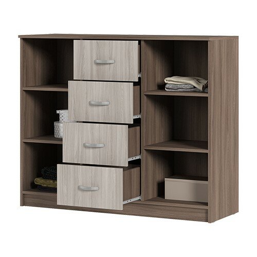 Содержит четыре выдвижных ящика и два отдела за распашными дверцами. Тип направляющих роликовые.