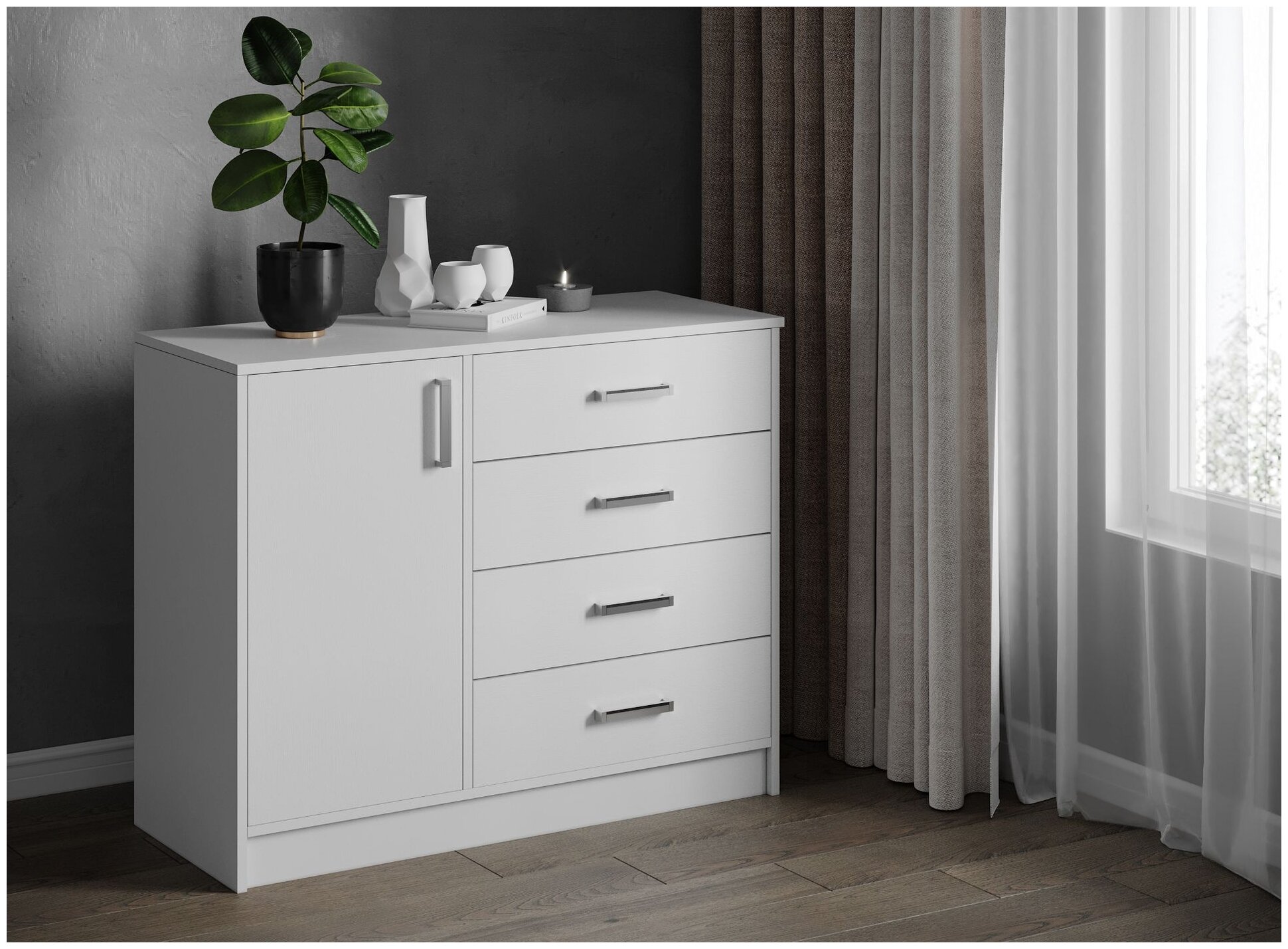 Белый комод с дверцей и ящиками Катрин 6 - это стильный и функциональный предмет мебели, который станет незаменимым элементом интерьера гостиной, офиса, прихожей, спальни или детской комнаты.
