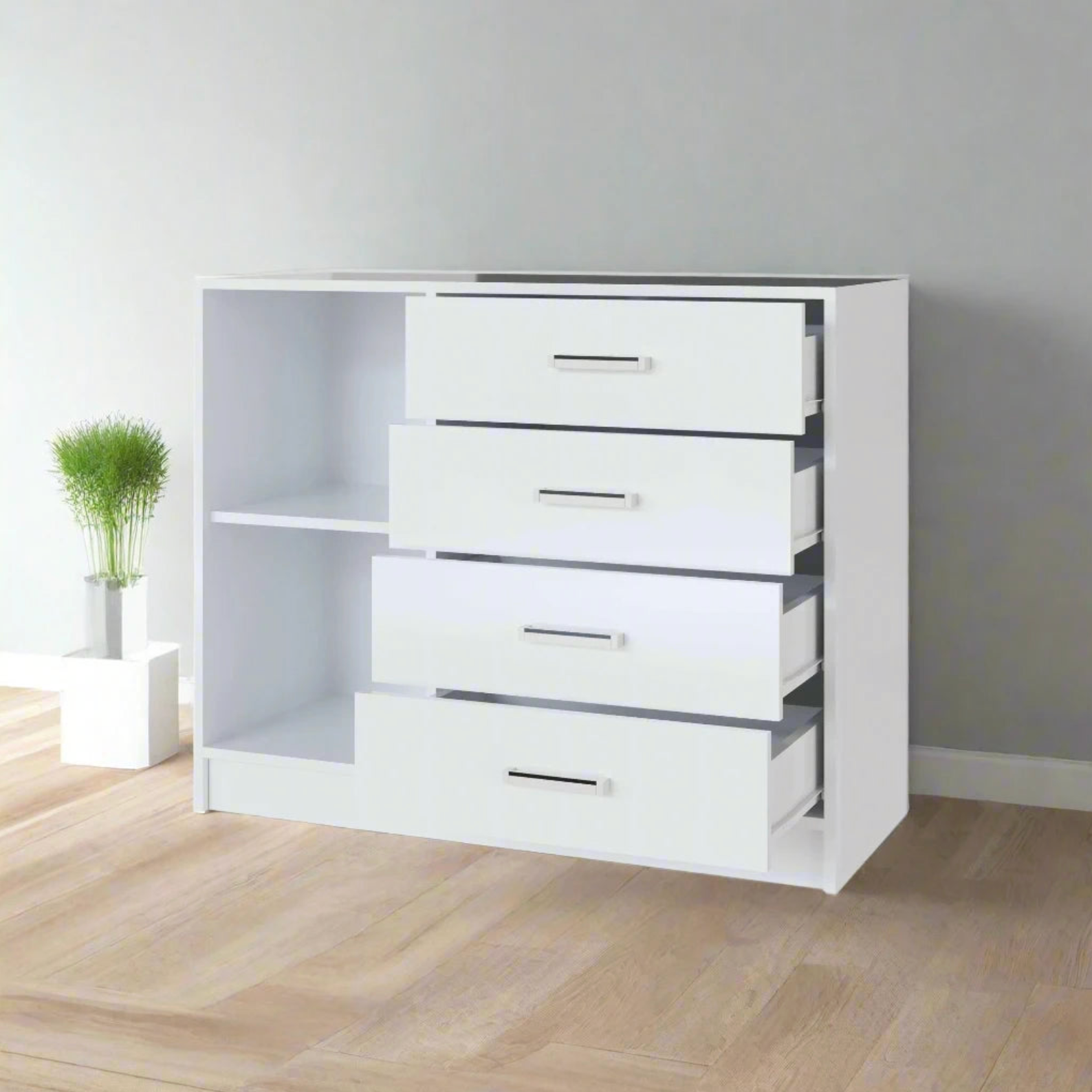 Выдвижные ящики комода установлены на роликовых направляющих, что обеспечивает плавное и бесшумное открывание и закрывание. Максимальная нагрузка на дно ящиков составляет 8-10 кг.
