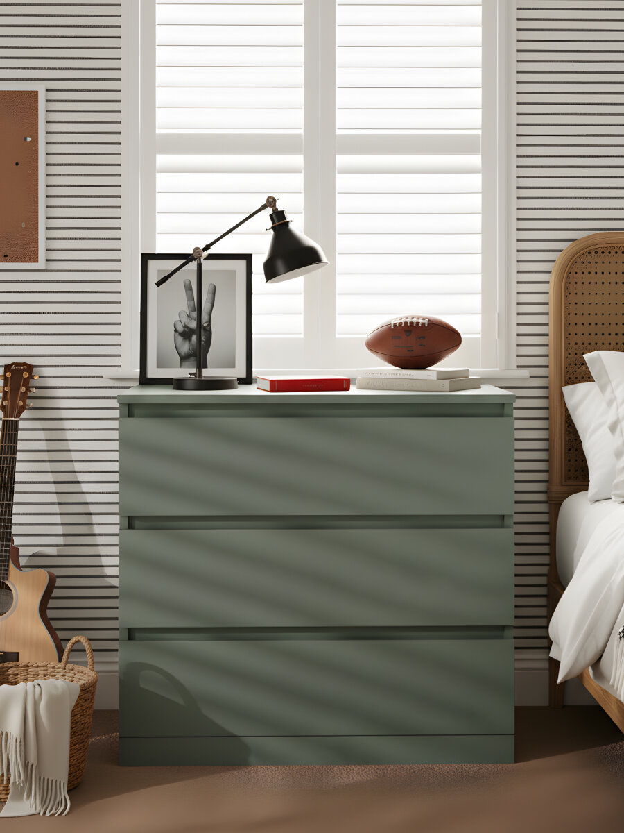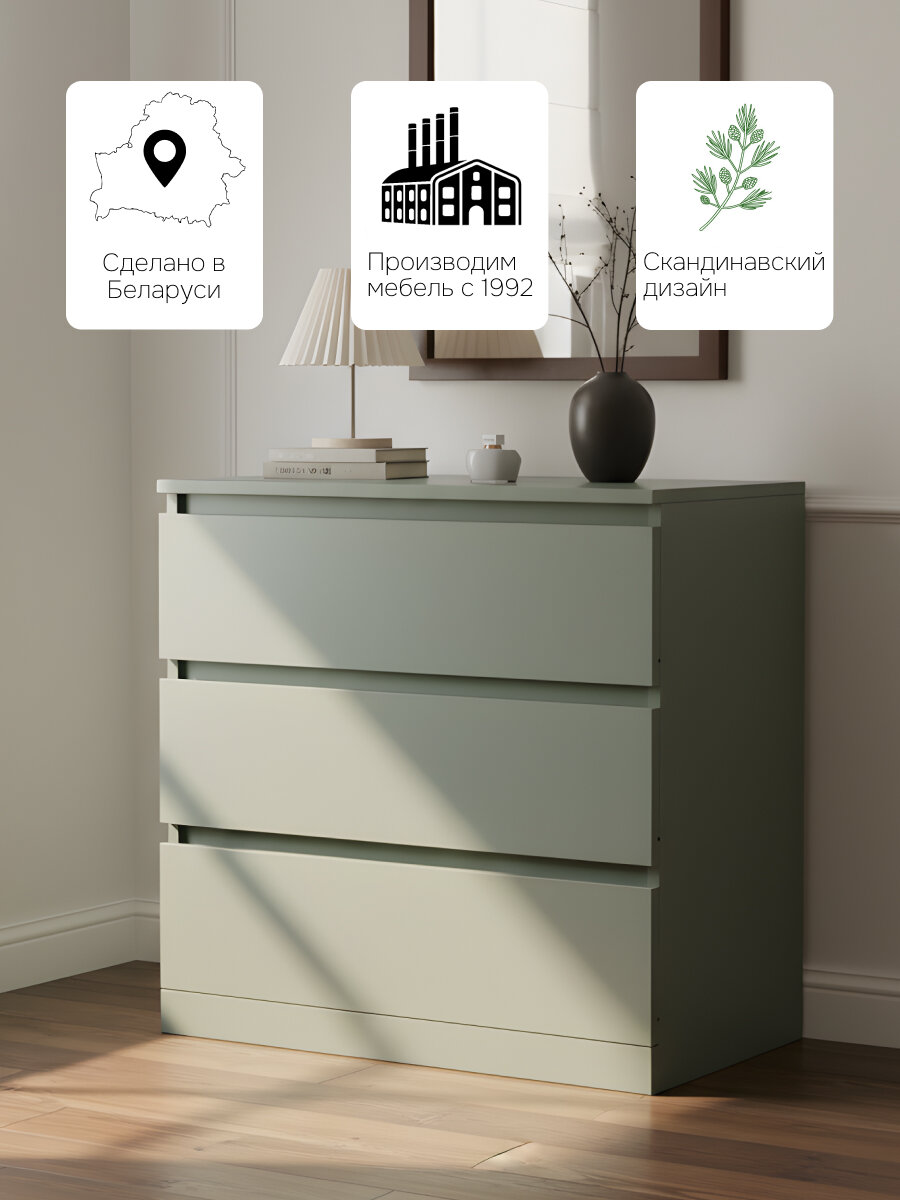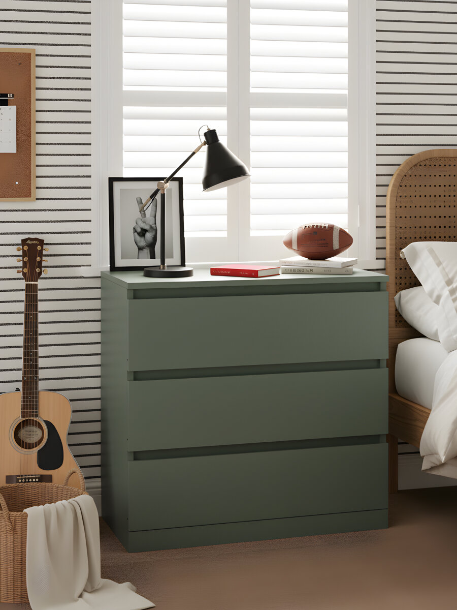 Комод Марм отлично подойдет для игрушек и детских вещей, для белья и одежды, для косметики, для книг и инструментов. Комод с ящиками в цвете зеленый самшит создаст порядок в любой комнате, будь то прихожая, спальня, гостиная, ванная или детская комната. Данная модель комода может быть использована как комод под телевизор, особенно если совместить два комода вместе. Цвет зеленый самшит близок к изумрудному цвету, поэтому комод прекрасно впишется в лофтовые помещения. Ящики комода для вещей Марм можно использовать для хранения вещей одного типа или тематически разделить их по назначению. Например, верхние ящики использовать под носки, перчатки и шарфы, средние - под футболки и майки, нижние - под пижамы и домашнюю одежду. В комплекте с комодом для одежды дополнительно поставляется органайзер для хранения. Комплект представляет собой 3 разделителя, которые можно установить внутри выдвижного ящика при сборке в нужном количестве. Также улучшили направляющие - теперь комод зеленый комплектуется металлическими роликовыми направляющими, которые будут плавно выдвигаться и тихо закрываться, более надежны и долговечны. Комод с ящиками для одежды в цвете зеленый самшит изготовлен белорусским производителем "Диприз" из высококачественного ЛДСП. Для задней стенки комода в спальню и дна ящиков использовалось ДВП. Деревянный комод с ящиками выполнен на высокоточном оборудовании, все кромки изделия обработаны ПВХ аккуратно, промышленным методом на современных станках, что обеспечивает ее плотное прилегание и прочность древесного слоя при контакте с влагой, устойчивость к влажности и деформации. Расположив мебель в прихожей, вы сможете организовать хранение обуви, аксессуаров и других необходимых предметов, сохраняя порядок и чистоту в вашем входном пространстве. Деревянный комод можно использовать с письменным столом для создания удобного офиса. Если вы обустраиваете детскую комнату, наш детский комод станет прекрасным дополнением к интерьеру, чтобы получился замечательный комод для игрушек. Поставьте его в спальню, и получится хороший комод для вещей с ящиками. Сборка комода лофт с органайзером домашних условиях не вызовет трудностей за счет понятной инструкции по сборке и комплекта необходимой фурнитуры. Наша компания обеспечивает надежную упаковку товара с дополнительной защитой для предотвращения повреждений при транспортировке. Камод Марм – это современное сочетание стиля и функциональности. Минималистичный дизайн и просторные ящики делают его идеальным выбором для хранения вещей и создания стильного интерьера. Комод для одежды отлично впишется в комнаты современного и скандинавского стиля, бохо, лофт, минимализм. Выбирая стильный и экологичный комод Марм, вы делаете ответственный выбор в пользу природы и создаете функциональное и эстетичное пространство для хранения вещей в вашем доме. Подчеркните уникальность и создайте свое уютное домашнее пространство с нашей мебелью. Мы заботимся о Вашем удобстве!