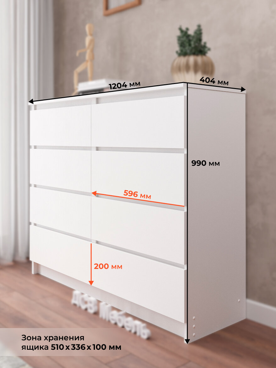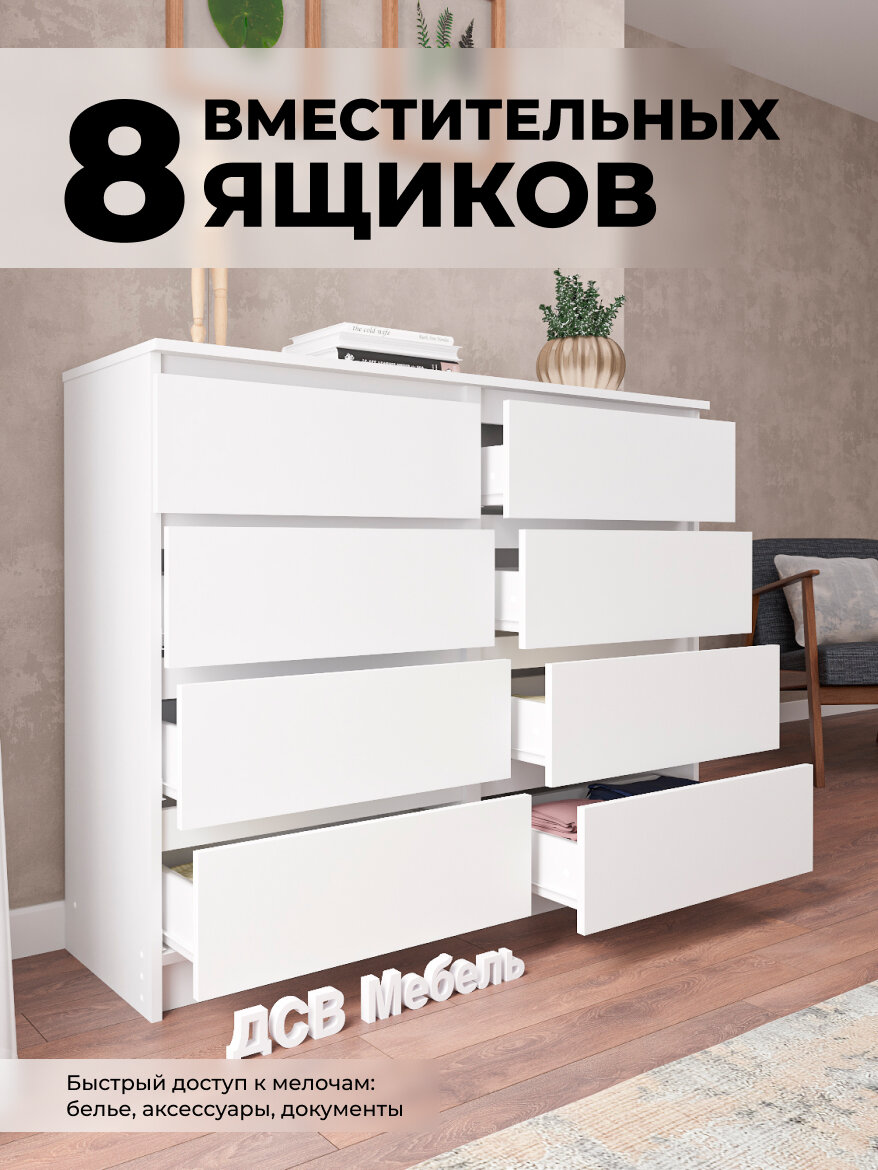 Комод для белья коллекции Мори МК1200.8 в стиле минимализма с 8 выдвижными ящиками. Корпус и фасады выполнены из ЛДСП белого цвета. Для выдвижения ящиков использованы роликовые направляющие. Комод разделен на две секции перегородками, в каждой секции 4 выдвижных ящика. Это позволяет более детально рассортировать вещи. На фасадах ящиков отсутствуют ручки. Ручками являются сами фасады, между которыми предусмотрены специальные отступы для удобства открывания. Этот комод не теряет своей актуальности и является классикой. Впишется в любой интерьер, добавит стиля и уюта. Подходит для любых комнат: для гостиной, спальни, детской комнаты, прихожей. Служит для хранения вещей: одежды, нижнего белья, детских игрушек, обуви, документов.