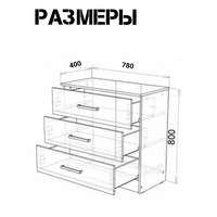 Габариты комода составляют 78 см в ширину, 40 см в глубину и 80 см в высоту. Вес изделия - 30 кг.