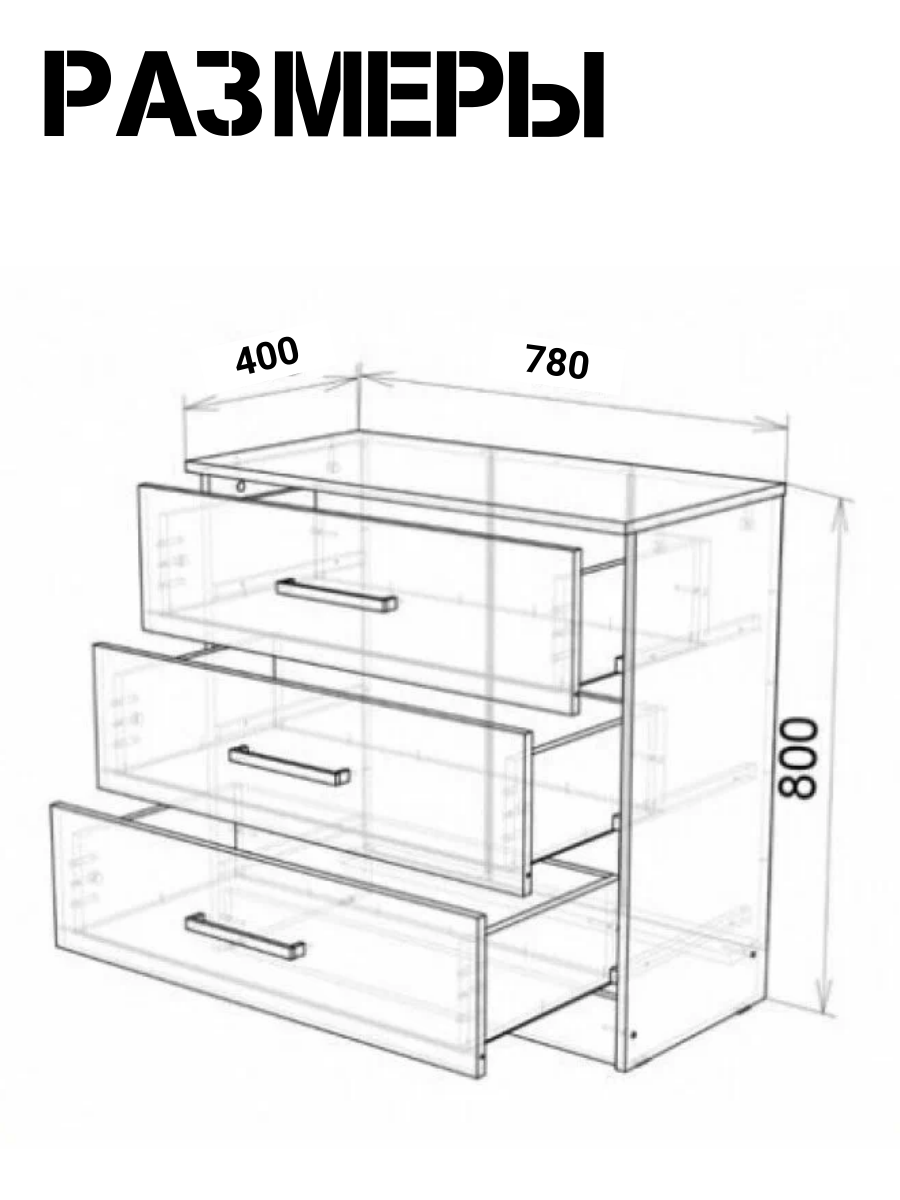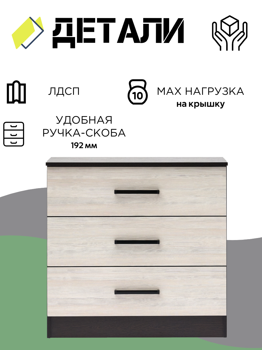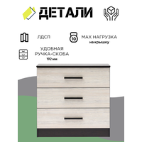 Комод оснащен тремя выдвижными ящиками, максимальная нагрузка на каждый из которых составляет 7 кг. Это обеспечивает удобное и безопасное хранение различных предметов.