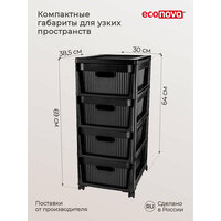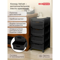 Многофункциональный комод из новой коллекции Velvet – удобное, красивое решение для организации хранения в доме. Узкий корпус делает его отличным выбором для небольших пространств, ниш. Универсальный, вместительный подходит для применения в любом помещении. За счёт компактных размеров напольная модель не занимает много места. Внутри изделия находятся четыре глубоких, выдвижных ящика. Эстетичные корзинки с ручками обеспечат вместимость для всех необходимых принадлежностей. Стенки контейнеров имеют декоративную рифленую фактуру. Функциональный мини стеллаж - крепкую, устойчивую конструкцию прямоугольной формы - пенала. Ширина емкости 30 см. Глубина 38,5 сантиметров. Высота (длина) 69 см. Складной каркас изготовлен из качественного материала: прочной, безопасной пластмассы. Прост в уходе, легко моется. Верхняя поверхность (панель) может использоваться как полка или столешница. Колесики ножки позволят без труда перемещать предмет по квартире, вращаются на 360 градусов, без стопоров. Поставляется в коробке в разобранном виде, инструкция в комплекте. Быстро собирается. Маленький пластиковый комодик идеально подойдёт для домашней системы хранения, на даче, в гостиной, гардеробной, прихожей (прихожки, коридора), туалета, балкона (лоджии), гаража, офиса. Поможет распределить разные мелочи по ящичкам, обеспечивая порядок. Высокий шкафчик вместит одежду, белье, обувь в гардеробе. Продукты, овощи, посуду, кухонную утварь, хозяйственные товары на кухне. Документы, тетради, бумаги, канцелярию в кабинете. Игрушки детей, книги, учебники, канцелярские наборы ребенка в детской. В ванной - полотенца, косметические средства. Инструменты, косметику – в салоне красоты, парикмахерской или аксессуары и другие штучки для творчества, рукоделия в творческой мастерской. Можно поставить в комнате у кроватки малыша, у кровати в спальне использовать как прикроватную тумбочку или туалетный столик. Пластмассовая этажерка впишется в современный стиль интерьера. Цвет сочетается с любым декором благодаря темной цветовой гамме. Стильный сканди дизайн шкафа сделает эту мебель акцентом, украшением, придаст эстетику. Станет практичным подарком на новоселье. Следите за полезными новинками, скидками, акциями, большими распродажами, самым широким ассортиментом в каталоге нашего магазина и брендов фирмы.