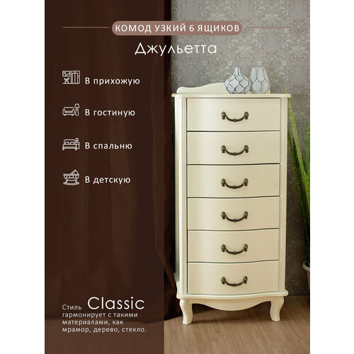 Классический комод Джульетта идеально впишется в традиционный интерьер дома или квартиры. Деревянное изделие обладает высокой прочностью и выполнено из качественных материалов. Для модели представлены универсальные цветовые решения. Конструкция аккуратно сглажена по углам. Плавные изгибы предмета мебели в сочетании с изящными ручками смотрятся очень эстетично. Вместительные ящики имеют оптимальную глубину.