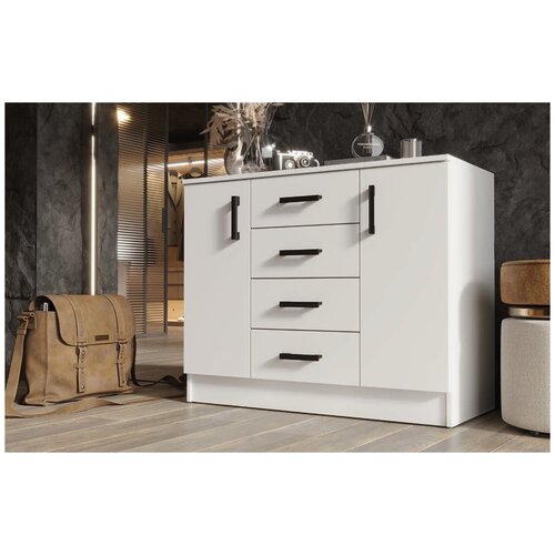 Комод оснащен четырьмя ящиками с роликовыми направляющими без доводчика. Максимальная нагрузка на ящик составляет 6 кг, что позволяет хранить в нем различные предметы.