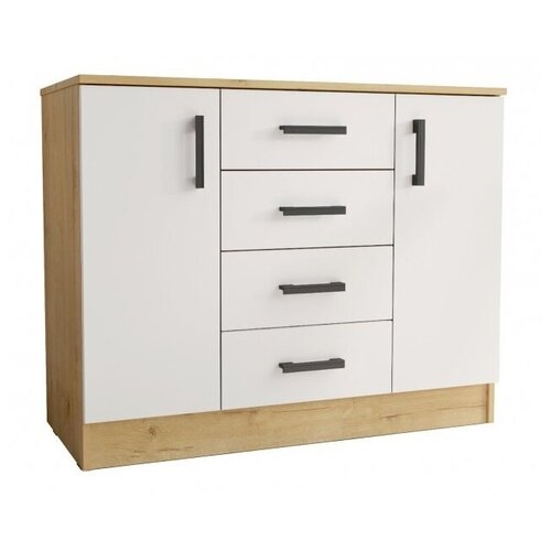 Комод оснащен четырьмя ящиками с роликовыми направляющими без доводчика. Это обеспечивает плавное и бесшумное открывание и закрывание ящиков, а также предотвращает случайное выпадение вещей.