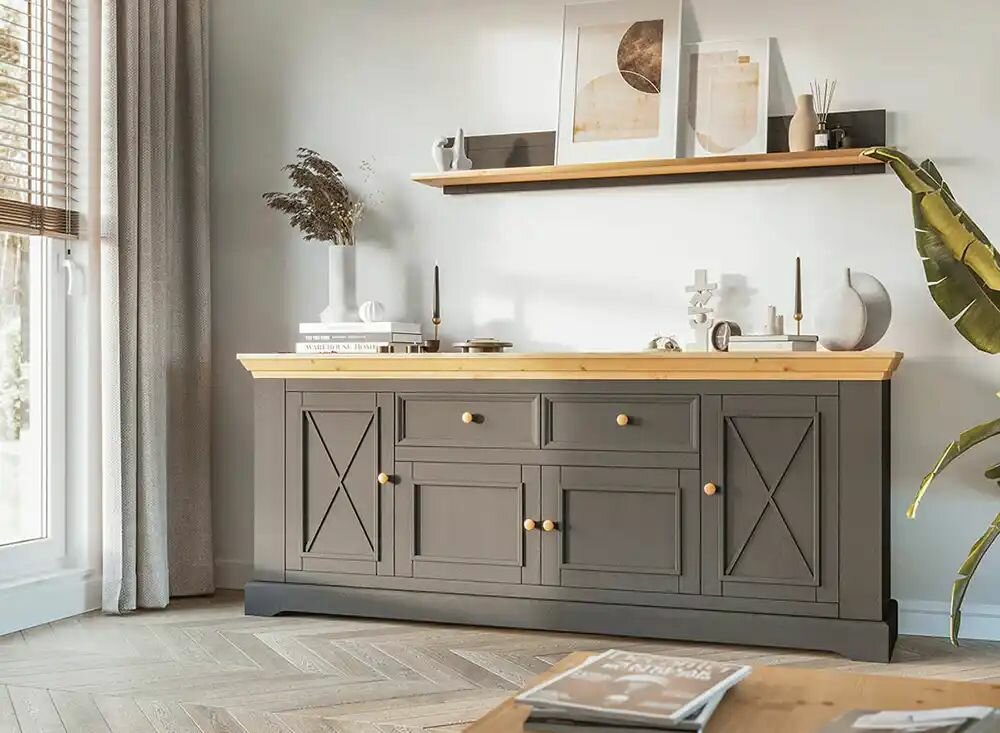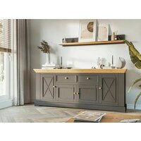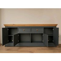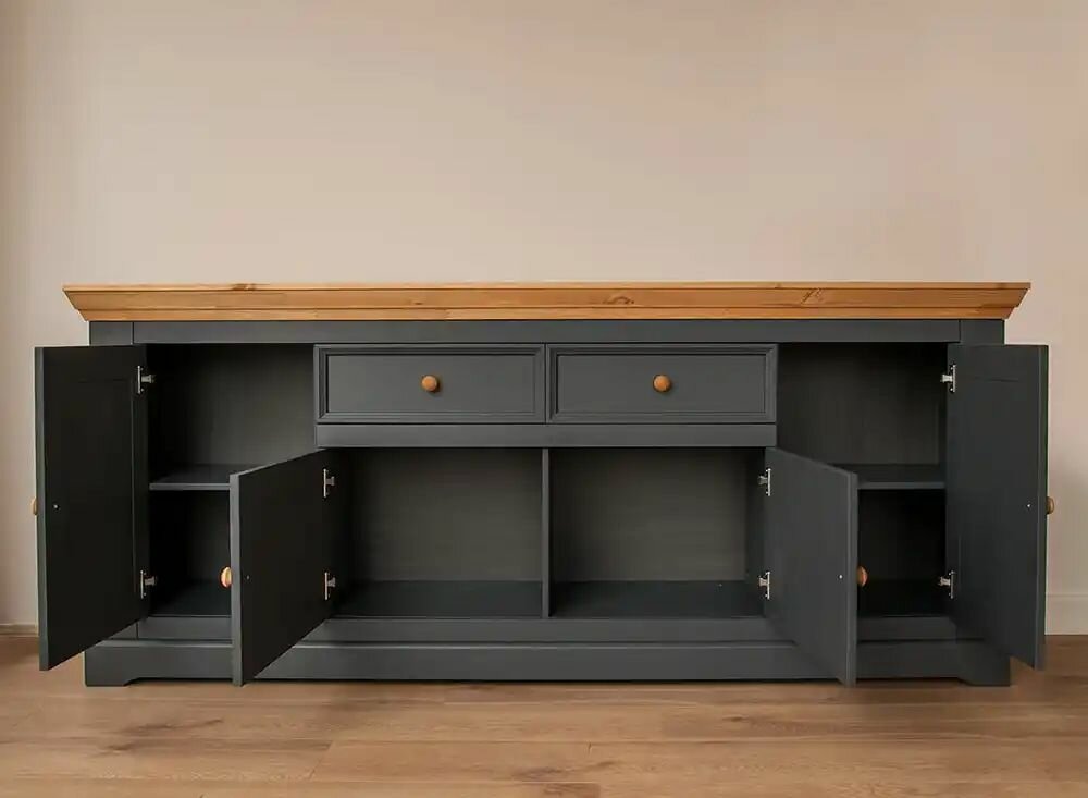 Основные характеристики: Габариты: 2090×420×881 мм (ШxГxВ) Два просторных выдвижных ящика на надежных роликовых направляющих Четыре удобные двери с металлическими хромированными ручками Внутри две боковые полки и одно большое центральное отделение Цвет: «Серый графит/Бейц»: поверхность покрыта лаком серого оттенка («графит»), а столешница выполнена в тёплом оттенке бейца, подчёркивая природную структуру древесины. Массивный устойчивый цоколь обеспечивает долговечность конструкции. Преимущества модели: Экологичный материал и безопасность для здоровья Простота сборки благодаря наличию подробной инструкции и всех необходимых комплектующих Высокое качество изготовления и отличная функциональность Собрать изделие самостоятельно легко, однако рекомендуется обратиться к профессиональному сборщику для идеального результата!