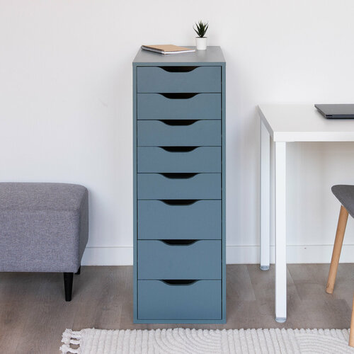 Комод оснащен восемью выдвижными ящиками разной глубины, предназначенными для хранения канцелярии, документов, учебников и других мелочей, которые всегда должны быть под рукой. Это решение позволяет поддерживать порядок и организованность, создавая комфортные условия для работы, учебы или творчества.