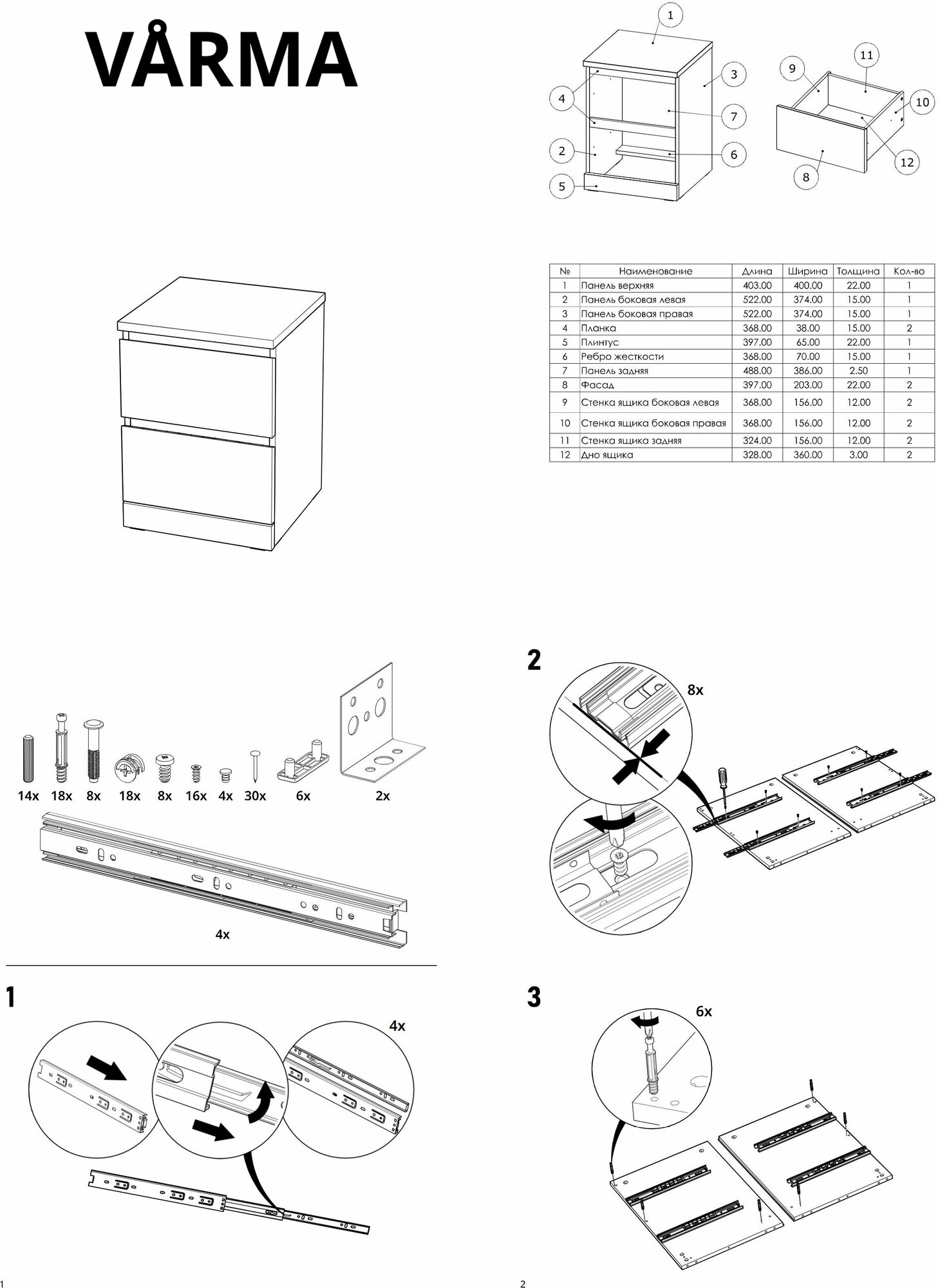 Комоды и тумбы отличаются по ширине и высоте, имеют различные размеры ящиков, и варианты компоновки. Глубина комодов и тумб ВАРМА одинакова, что позволяет сочетать их между собой, а также эффективно использовать каждый сантиметр комнатного пространства.