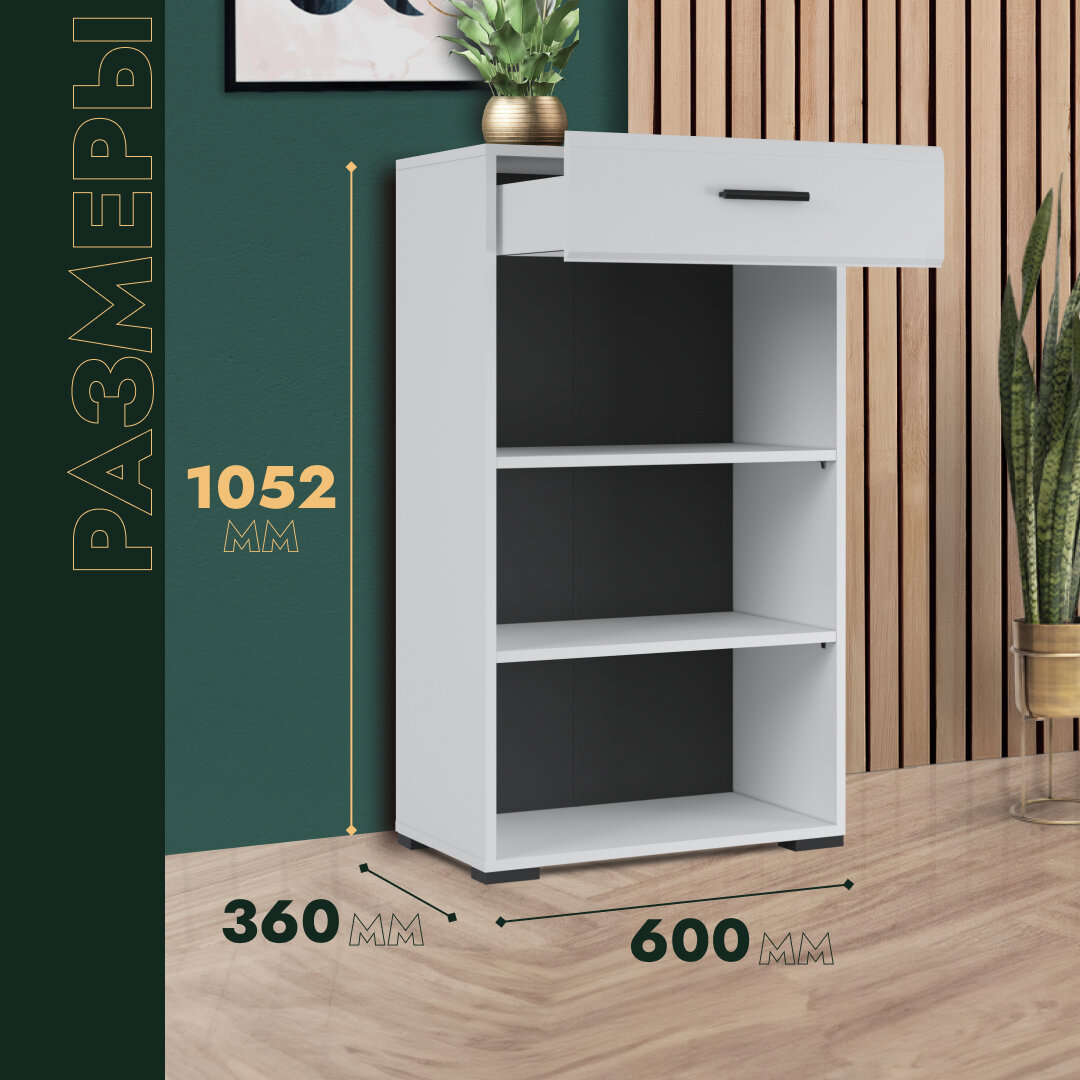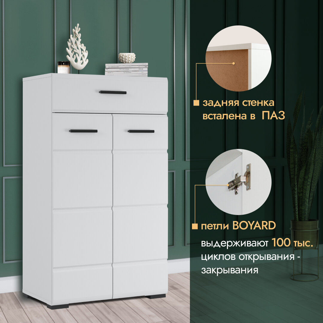 Комод Йорк сочетает в себе практичность и эффектный внешний вид. Глянцевые белые фасады High Gloss из МДФ наполняют помещение светом, делают его воздушнее. Тумба оснащена выдвижным ящиком на телескопических направляющих полного выдвижения для хранения необходимых мелочей. Отделение с распашными дверями укомплектовано вместительными полками для коробок с обувью или сумок. Идеально компонуется со всеми модулями системы Йорк.