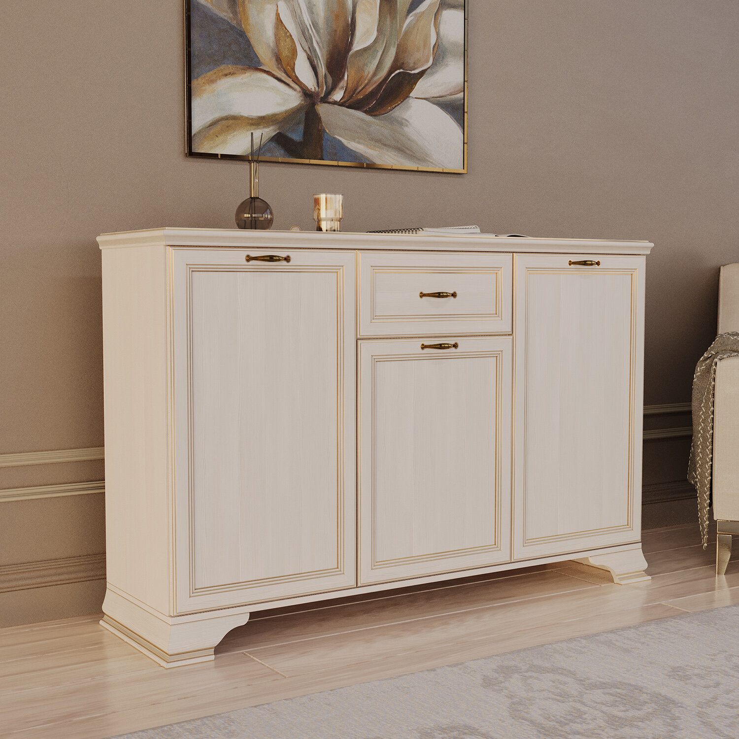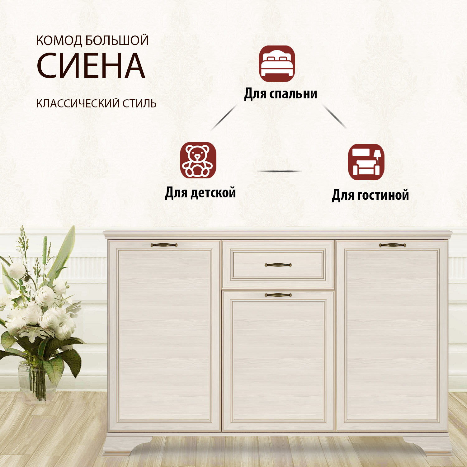 Большой комод 139,4х38,3х90,9 с дверками и ящиками бежевый Сиена Кураж Если вам нужно купить недорогой и функциональный комод в спальню или гостиную присмотритесь данной модели. Классический стиль популярен в любые времена, а интерьер в таком стиле дает ощущение уверенности и покоя владельцу дома. Модуль очень функционален и практичен. Он может быть использован как ТВ тумба для телевизора с большой диагональю или на его столешнице можно установить рамочки с фото, вазы и другие красивые предметы. Для хранения вещей вам доступно 3 отделения с дверками, каждое из которых разделено полочкой для вашего удобства. Для различных мелочей предназначен выдвижной ящик. Материалы производства ЛДСП с декоративной отделкой МДФ. Отблески золотой патины подчеркивают рельеф фигурных деталей: профиля и опор. На фасадах красуются металлические ручки цвета «старая бронза». - высокие опоры обеспечивают доступ к пространству под комодино для уборки; - высококачественные материалы и фурнитура дают гарантию долгого срока службы мебели. ЛДСП класса эмиссии Е 1 безопасно для вашего дома; - петли дверок оснащены доводчиком, а выдвижные ящики шариковыми направляющими; - комод очень вместителен и функционален. Многообразие модулей в линейке «Сиена» дает вам возможность проявить творческий подход и создать свой неповторимый интерьер гостиной или спальни.