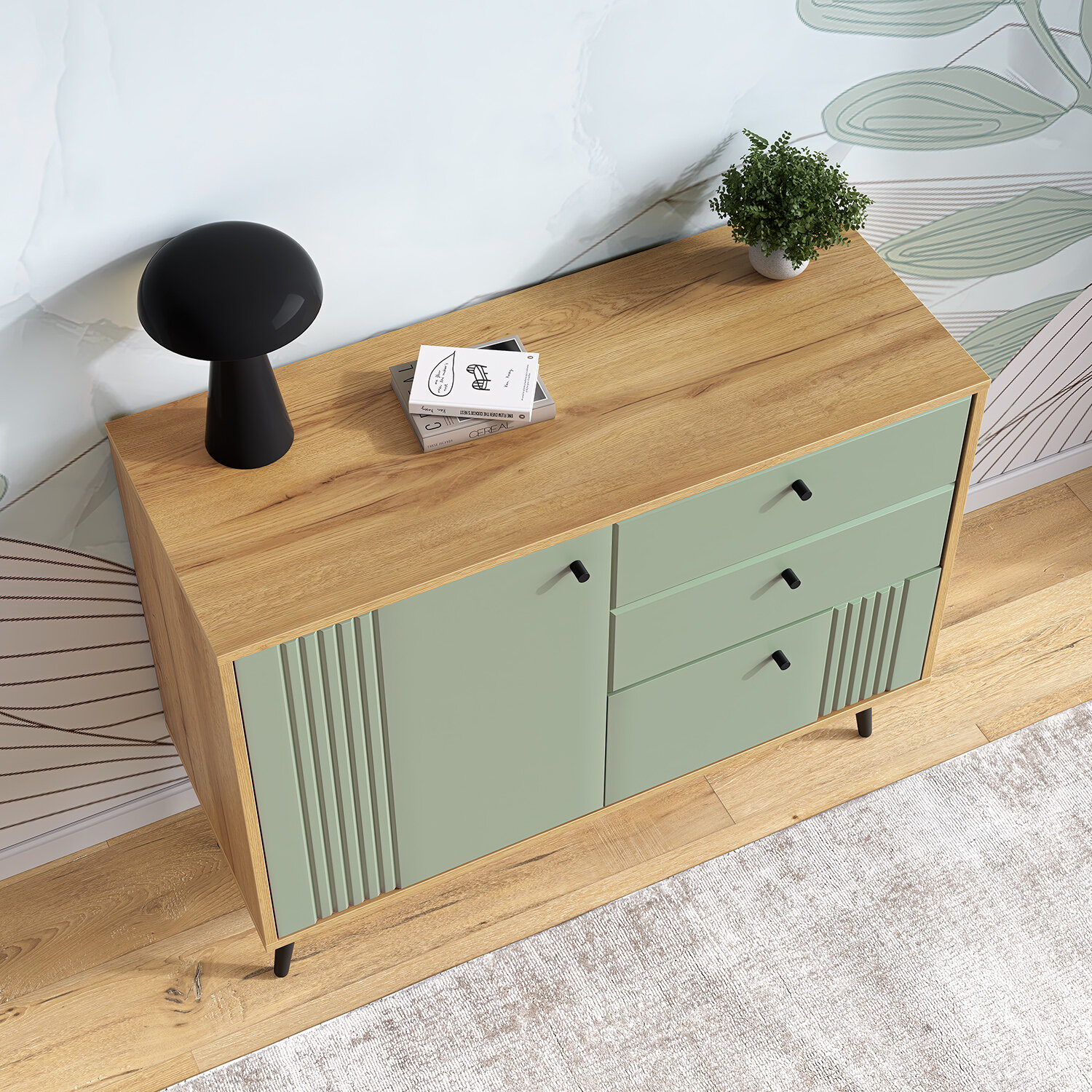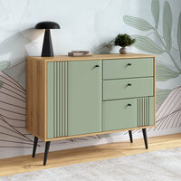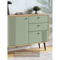 Комод оснащен тремя ящиками с шариковыми направляющими, обеспечивающими плавное и бесшумное открывание. Материал корпуса - ЛДСП, а фасад выполнен из МДФ с покрытием из пленки ПВХ. Это обеспечивает долговечность и устойчивость к повреждениям.