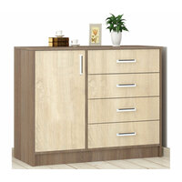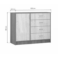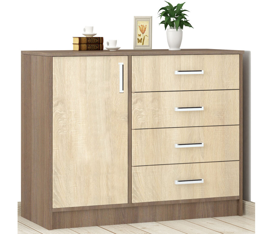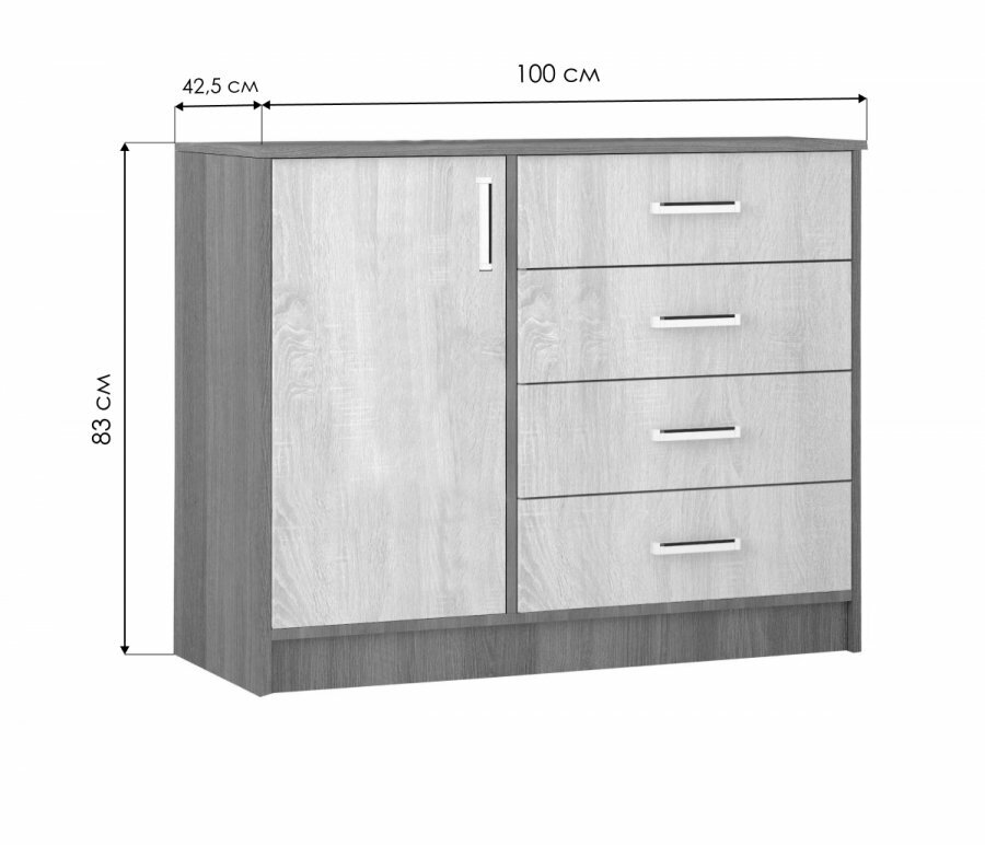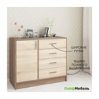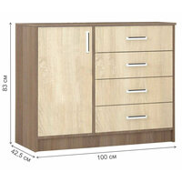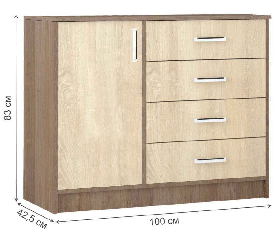 комод с двумя секциями: отделение с распашным фасадом и выдвижные ящики; выдвижные ящики установлены на роликовых направляющих; максимальная распределенная нагрузка для выдвижных ящиков на дно — 8-10 кг