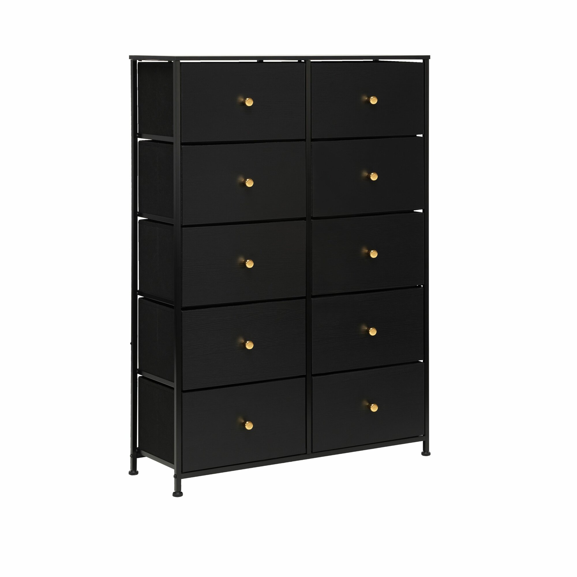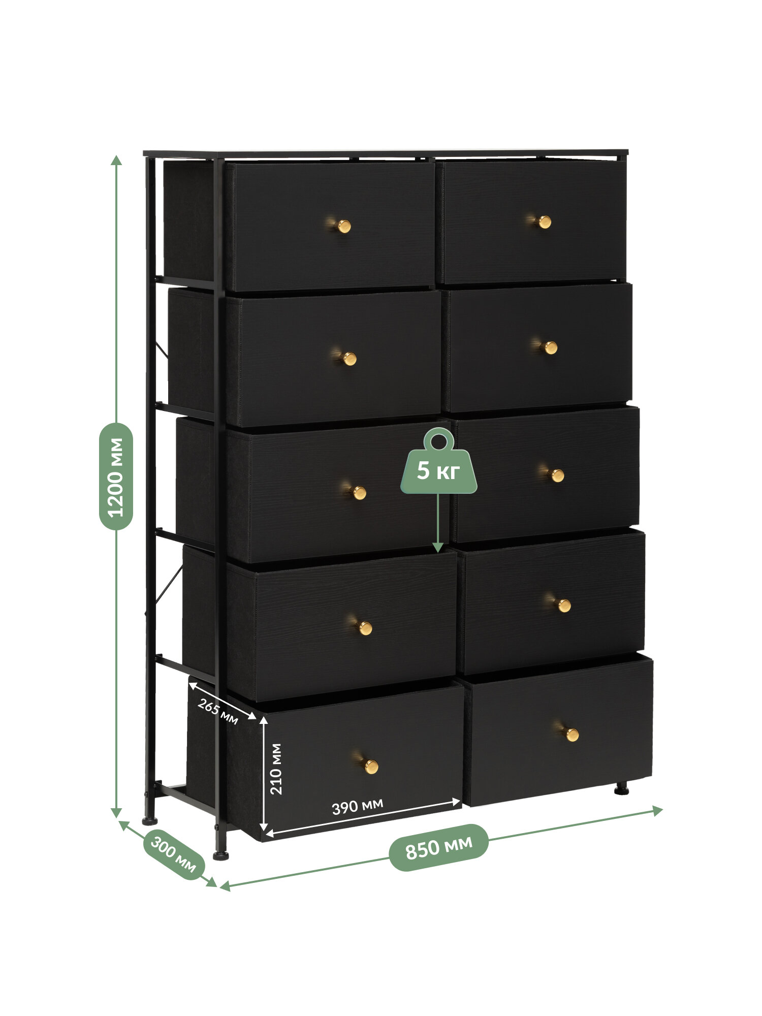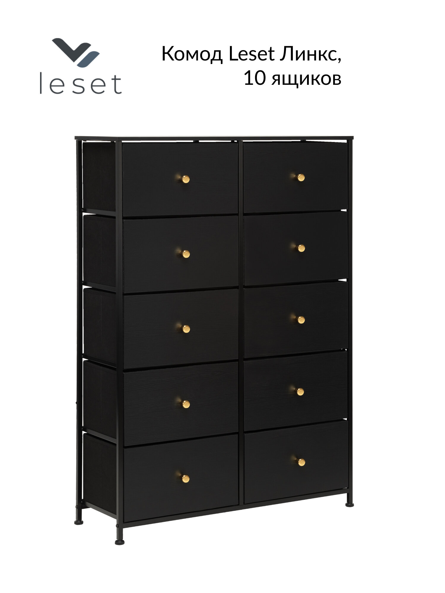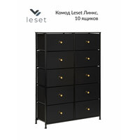 Комод с 10 ящиками Leset Линкс – это конструкция, обеспечивающая много места для хранения, при этом занимает мало места. Будет уместен везде: используйте для одежды, как тумбу под ТВ, в прихожую как мебель для хранения обуви и мелочей, мебель для ванной. Модульный комод получил стальной каркас и надежные пластиковые ножки, которые сберегут пол. Ящики – МДФ (фасад) с металлическими ручками золотого цвета и нетканый материал – спанбонд. Наличие водостойкой верхней панели из МДФ позволит использовать комод даже в ванной комнате. Преимущества: Модульность – сочетается с другими комодами Leset; Рама с нескользящими ножками долговечна, обеспечивает хорошую посадку и не вредит полу; Быстрая сборка – 10 минут. Рекомендуем прикручивать комод к стене с помощью шурупов (идут в комплекте), согласно инструкции. Это исключит возможность опрокидывания комода (особенно важно для детских комнат и помещений с маленькими детьми). Полка (ШxГxВ), мм: 855x300x12, 1 шт. Ящики (ШxГxВ), мм: 390x265x210, 10 шт. Высота ножек до перекладин, мм:• С лицевой стороны – 44• С боковой стороны – 67. Регулируемые по высоте ножки (10 мм).