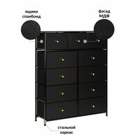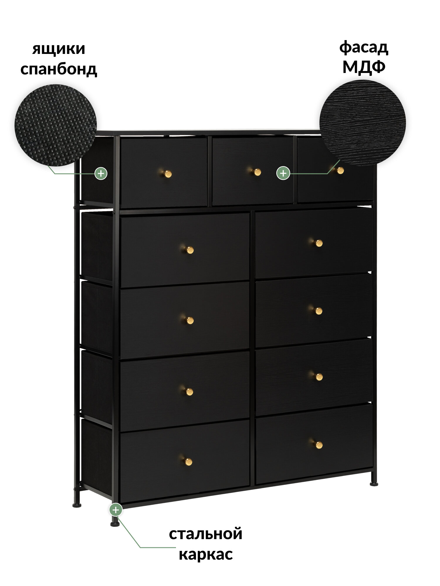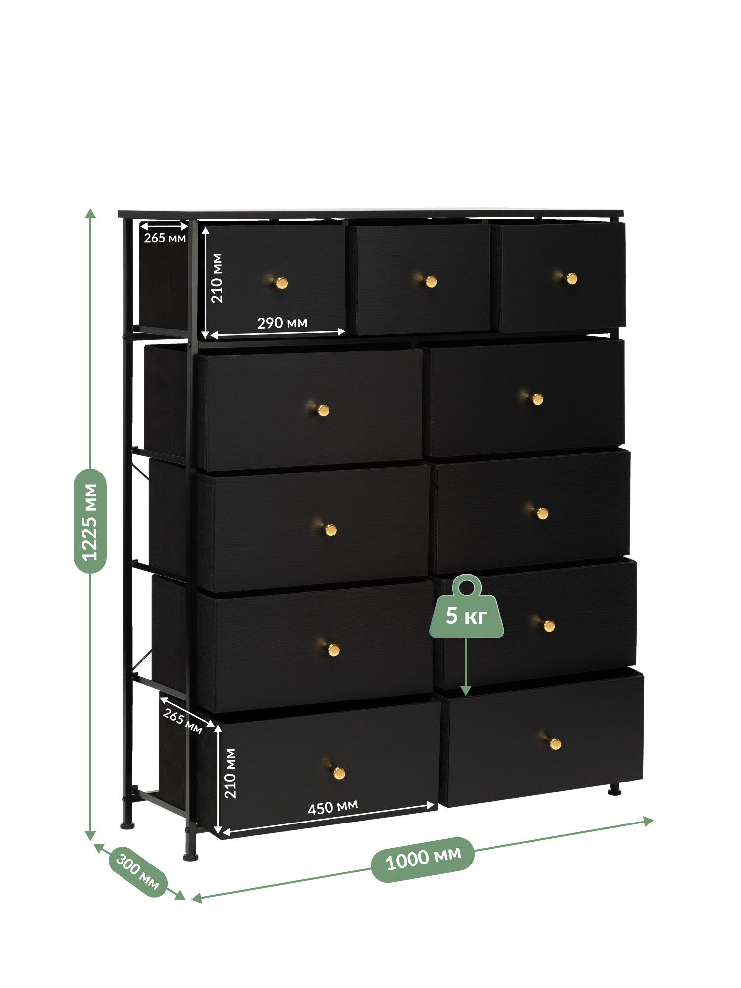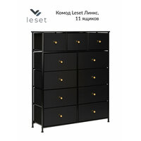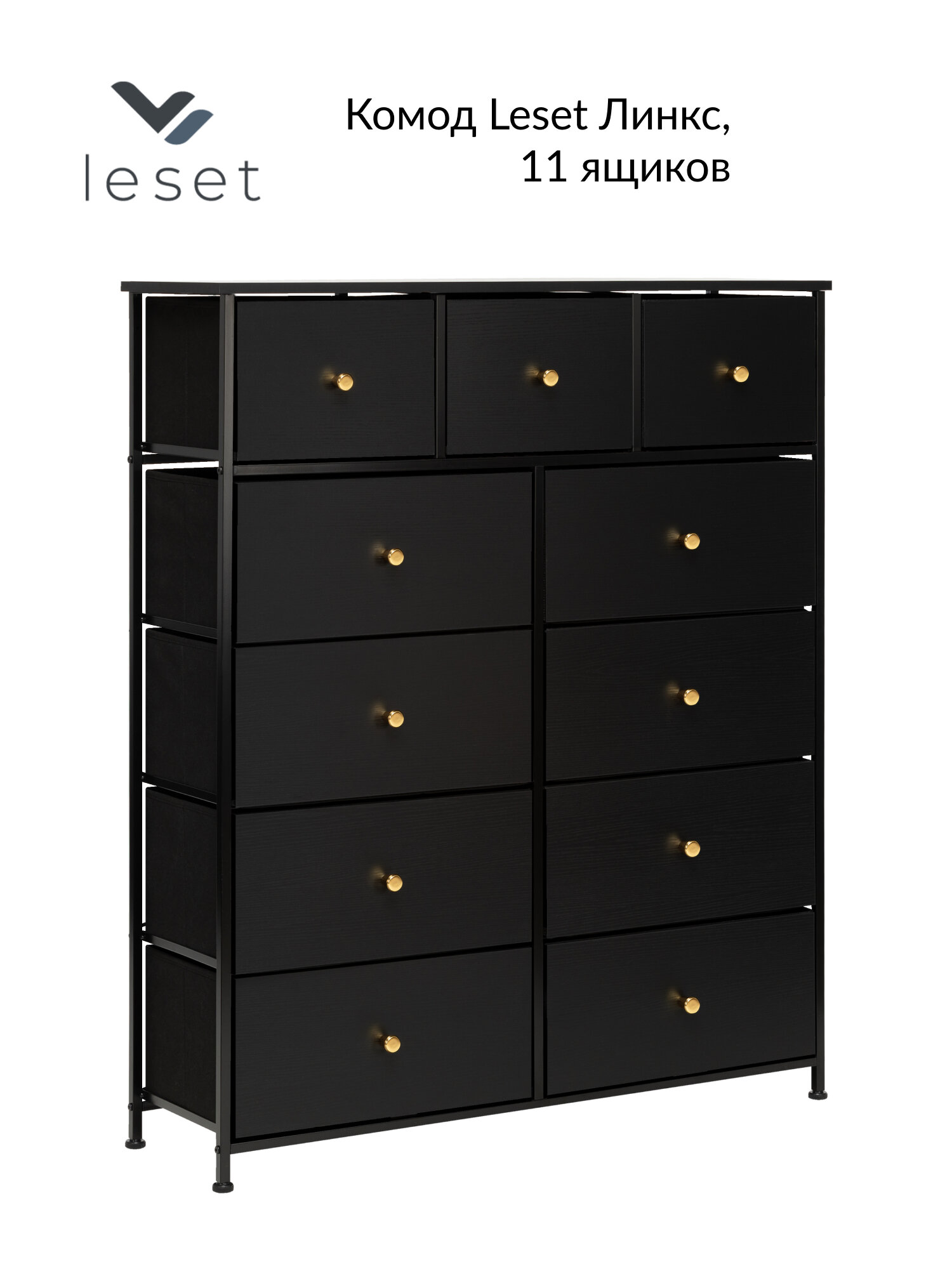 Комод с 11 ящиками Leset Линкс – это конструкция, обеспечивающая много места для хранения, при этом занимает мало места. Будет уместен везде: используйте для одежды, как тумбу под ТВ, в прихожую как мебель для хранения обуви и мелочей, мебель для ванной. Модульный комод получил стальной каркас и надежные пластиковые ножки, которые сберегут пол. Ящики – МДФ (фасад) с металлическими ручками золотого цвета и нетканый материал – спанбонд. Наличие водостойкой верхней панели из МДФ позволит использовать комод даже в ванной комнате. Преимущества: Модульность – сочетается с другими комодами Leset; Рама с нескользящими ножками долговечна, обеспечивает хорошую посадку и не вредит полу; Быстрая сборка – 10 минут. Рекомендуем прикручивать комод к стене с помощью шурупов (идут в комплекте), согласно инструкции. Это исключит возможность опрокидывания комода (особенно важно для детских комнат и помещений с маленькими детьми). Полка (ШxГxВ), мм: 1000x300x15, 1 шт. Ящики (ШxГxВ), мм: 290x265x210, 3 шт; 450x265x210, 8 шт. Высота ножек до перекладин, мм:• С лицевой стороны – 44;• С боковой стороны – 67. Регулируемые по высоте ножки (10 мм). Возможность крепить к стене.