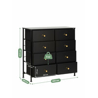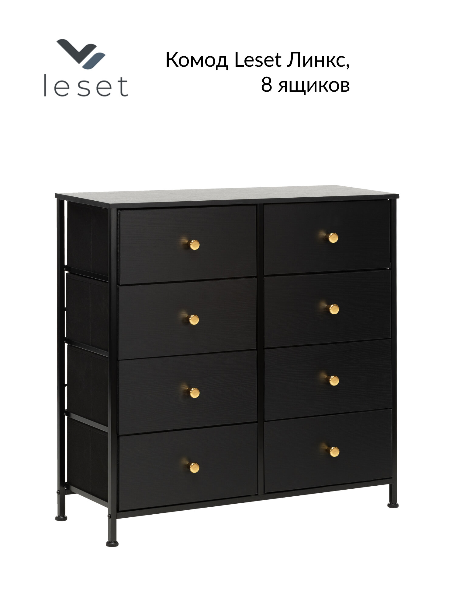 Комод с 8 ящиками Leset Линкс – это конструкция, обеспечивающая много места для хранения, при этом занимает мало места. Будет уместен везде: используйте для одежды, как тумбу под ТВ, в прихожую как мебель для хранения обуви и мелочей, мебель для ванной. Модульный комод получил стальной каркас и надежные пластиковые ножки, которые сберегут пол. Ящики – МДФ (фасад) с металлическими ручками золотого цвета и нетканый материал – спанбонд. Наличие водостойкой верхней панели из МДФ позволит использовать комод даже в ванной комнате. Преимущества: Модульность – сочетается с другими комодами Leset; Рама с нескользящими ножками долговечна, обеспечивает хорошую посадку и не вредит полу; Быстрая сборка – 10 минут. Рекомендуем прикручивать комод к стене с помощью шурупов (идут в комплекте), согласно инструкции. Это исключит возможность опрокидывания комода (особенно важно для детских комнат и помещений с маленькими детьми). Полка (ШxГxВ), мм: 800х300х12, 1 шт. Ящики (ШxГxВ), мм: 360х265х170, 8 шт. Высота ножек до перекладин, мм:• С лицевой стороны - 61;• С боковой стороны – 77. Регулируемые по высоте ножки (10 мм).