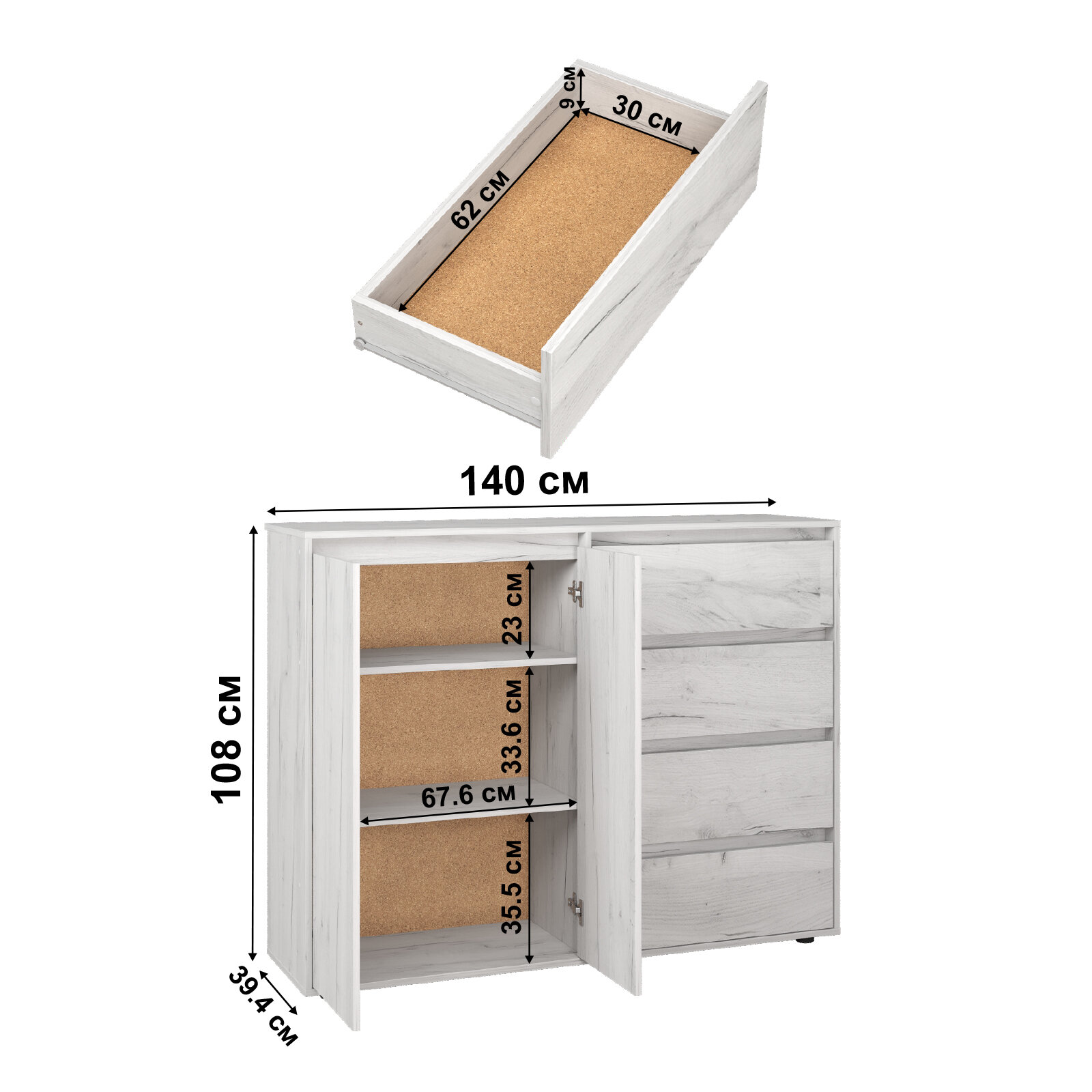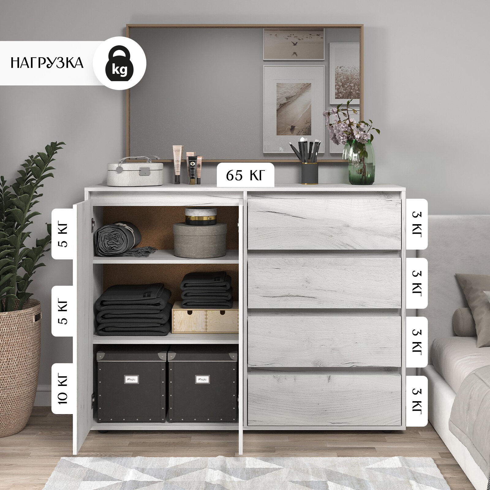 Комод оснащен четырьмя ящиками, что позволяет хранить в нем большое количество вещей. Отделение с дверцами и полками позволяет использовать комод для хранения сразу нескольких категорий вещей.