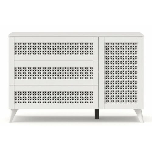 Комод Квебек — эффектная модель с необычным дизайном рамочных фасадов из МДФ: они украшены декором, имитирующим ротанговое плетение. Такой комод станет украшением любой комнаты, а собрав несколько предметов коллекции Квебек, вы сможете оформить эффектный интерьер в стиле кантри или прованс. Модель опирается на высокие, расставленные в стороны ножки. Благодаря этому комод выглядит легким и повышается его устойчивость. Опоры выполнены из прочного пластика, которому не повредит влажная уборка напольного покрытия.