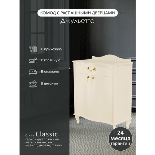 Комод Джульетта с распашными дверцами подойдёт под классический интерьер квартиры или дома. Плавные изгибы деревянной модели в сочетании с изящными ручками смотрятся эстетично. Конструкция аккуратно сглажена по углам. Модель имеет основные цветовые решения и будет удачно смотреться в традиционном интерьере квартиры или дома.