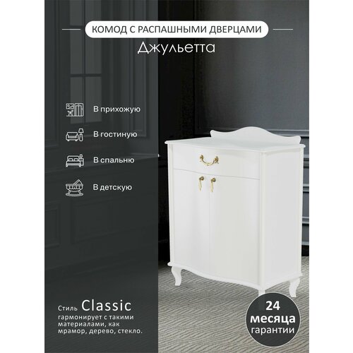 Комод Джульетта с распашными дверцами подойдёт под классический интерьер квартиры или дома. Плавные изгибы деревянной модели в сочетании с изящными ручками смотрятся эстетично. Конструкция аккуратно сглажена по углам. Модель имеет основные цветовые решения и будет удачно смотреться в традиционном интерьере квартиры или дома.