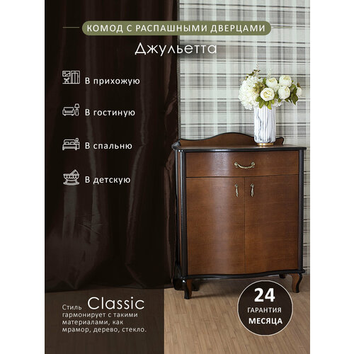 Комод Джульетта с распашными дверцами подойдёт под классический интерьер квартиры или дома. Плавные изгибы деревянной модели в сочетании с изящными ручками смотрятся эстетично. Конструкция аккуратно сглажена по углам. Модель имеет основные цветовые решения и будет удачно смотреться в традиционном интерьере квартиры или дома.