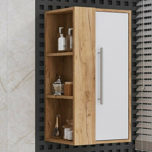 Основные характеристики: Материалы: Корпус выполнен из влагостойкого ЛДСП в оттенке "Дуб Крафт золотой", который придаёт мебели натуральность и уют. Фасад — из МДФ, покрытого белой глянцевой плёнкой, что добавляет свежести и визуально расширяет пространство.