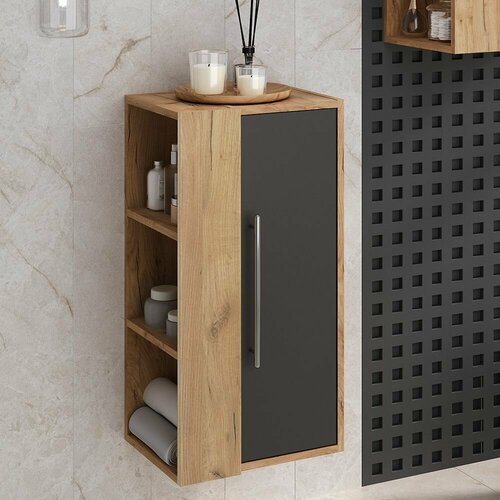 Основные характеристики: Материалы: Корпус выполнен из влагостойкого ЛДСП в оттенке "Дуб Крафт золотой", который придаёт мебели натуральность и уют. Фасад — из МДФ, покрытого темно-серой матовой плёнкой.
