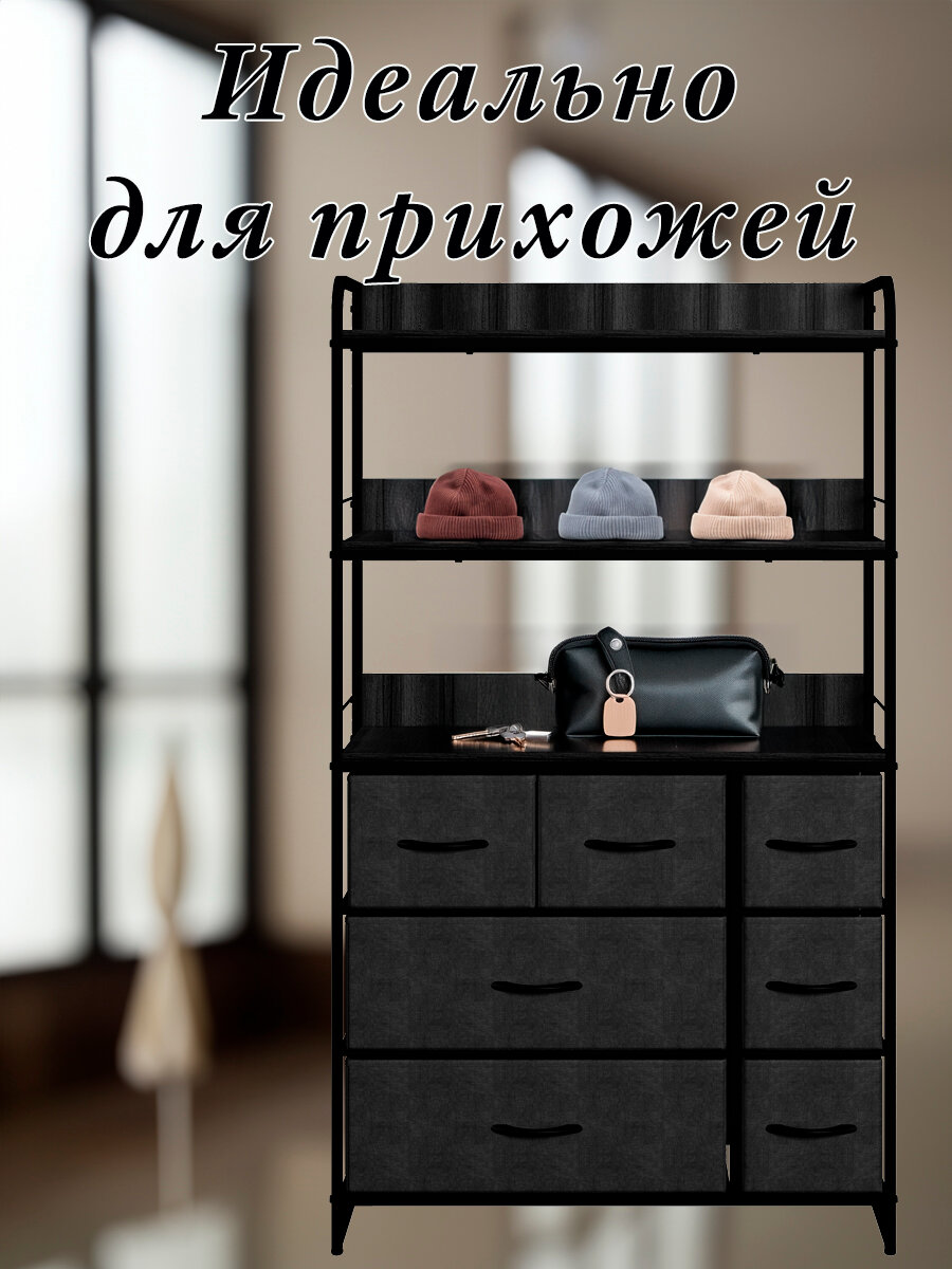 Прочный каркас из стали окрашен в чёрный цвет, что придаёт конструкции устойчивость и современный, минималистичный вид. Верхние полки выполнены из влагостойкого МДФ — их легко очищать, и они устойчивы к влаге, что делает комод универсальным: для спальни, прихожей, ванной или детской.