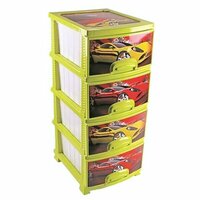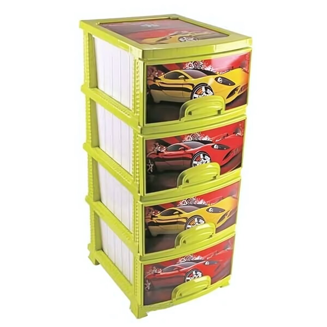 пластиковый комод с четырьмя выдвижными ящиками, ярко-желтый корпус с белыми ящиками, украшенными изображением автомобилей, ручки для удобства открывания, сетчатая текстура по бокам, плоская верхняя поверхность для использования в качестве подставки