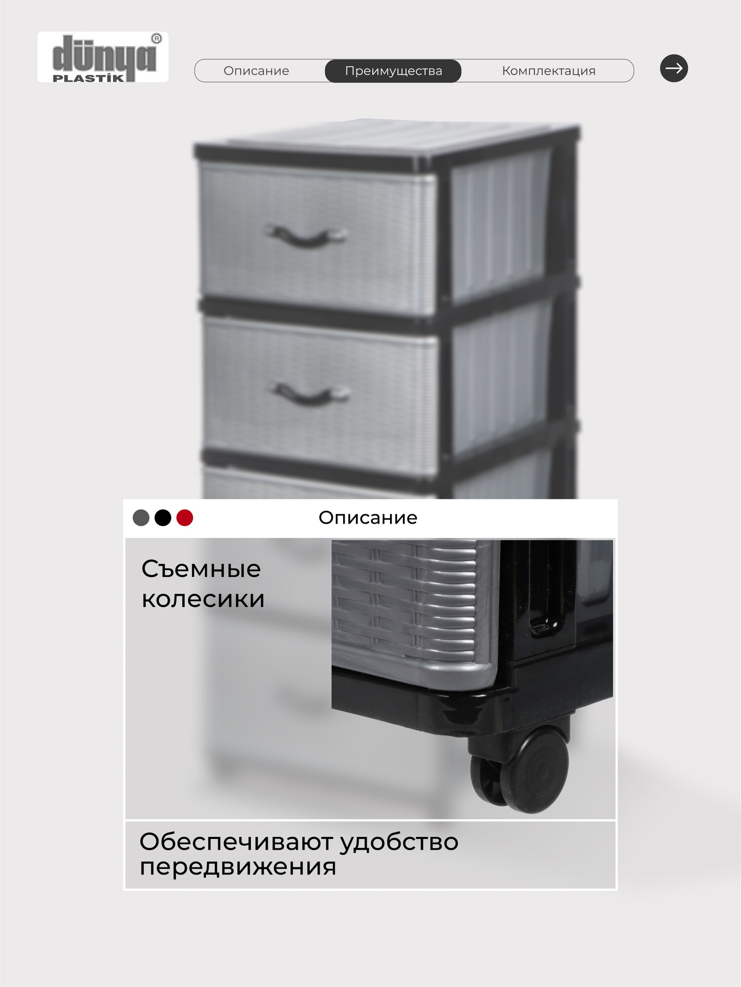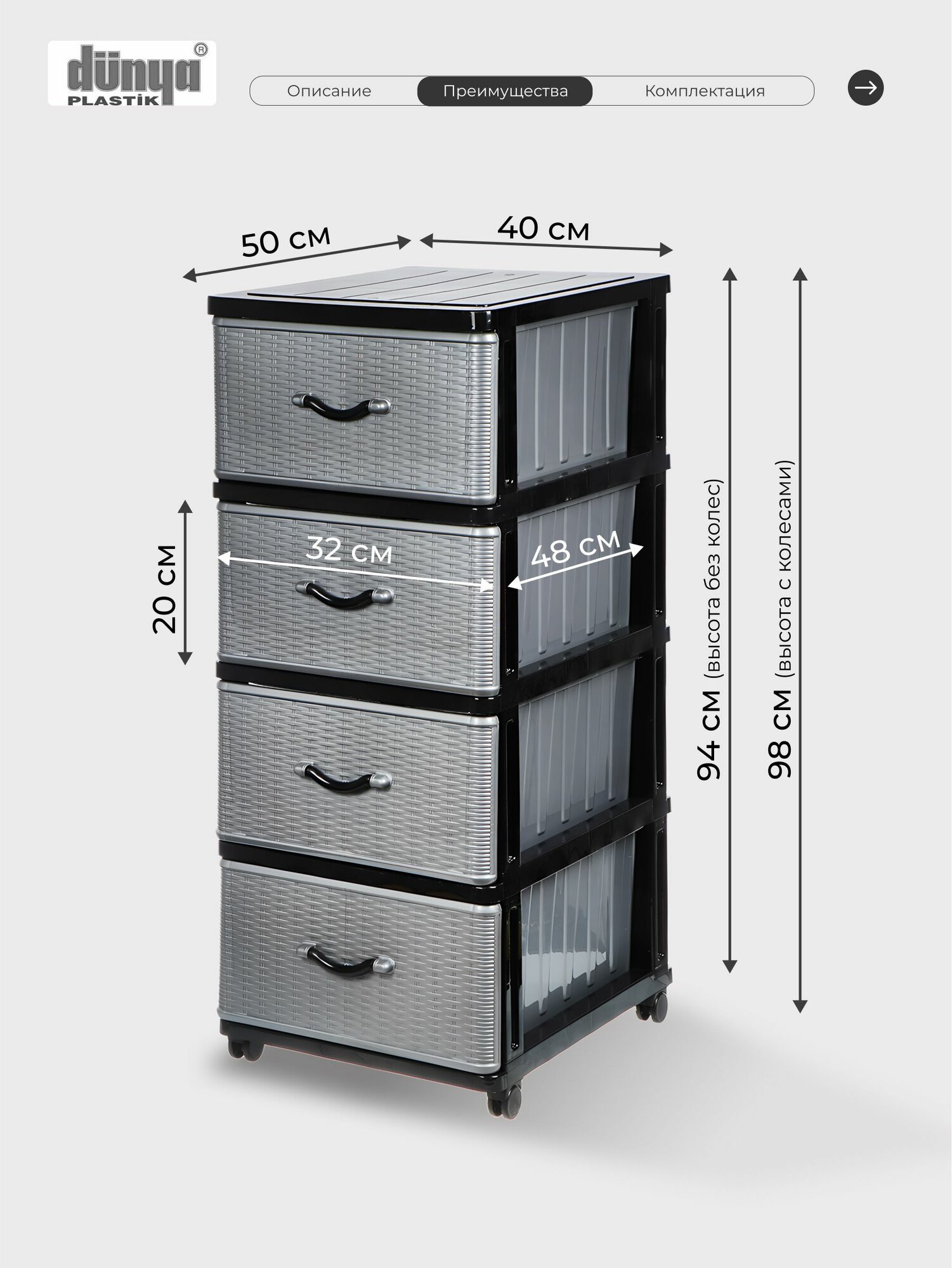 Dunya Plastik, Комод с ящиками, для вещей, пластиковый, на колесах, 40х50х94 см, черно-серебряный, Дюна: сравнение цен, характеристики, фото, актуальное наличие и цены.