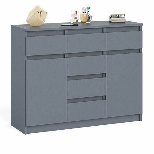 - Комод оборудован шестью выдвижными ящиками и двумя закрытыми отделениями с полками. В верхней части комода расположены три ящика, под ними в центре отделение с ещё тремя ящиками и по бокам отделения с дверками.