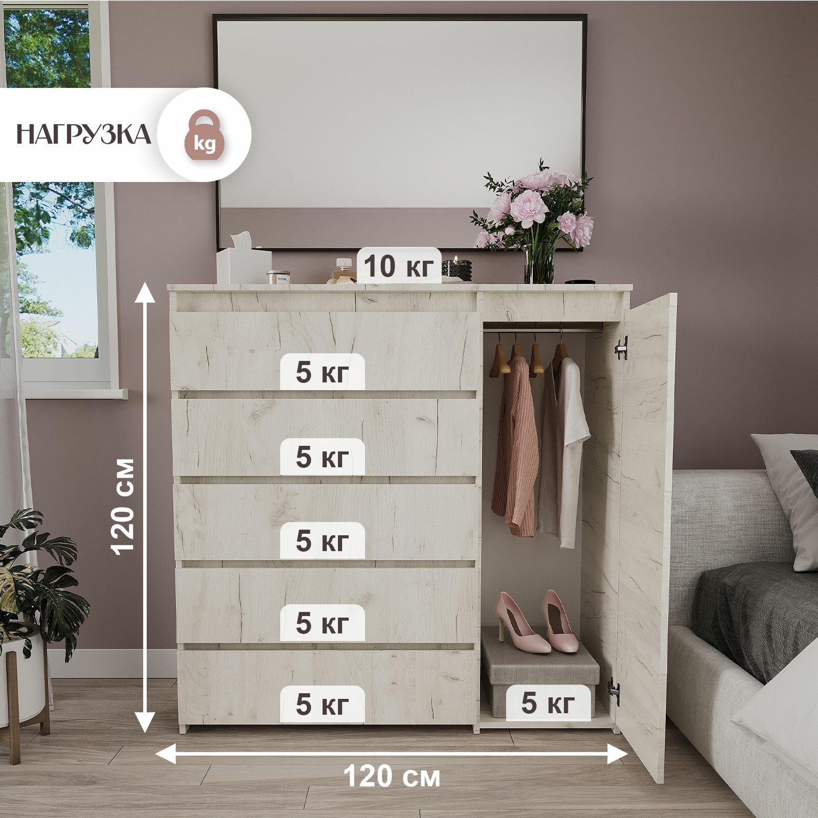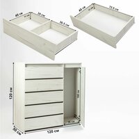 Комод оснащен штангой для вешалок, что позволяет удобно хранить одежду и плечики. В пяти выдвижных ящиках можно хранить различные мелочи для дома, а на вешалке - одежду.