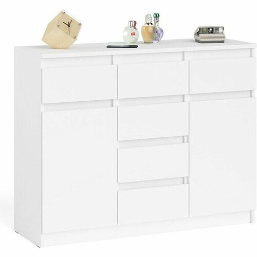 - Комод оборудован шестью выдвижными ящиками и двумя закрытыми отделениями с полками. В верхней части комода расположены три ящика, под ними в центре отделение с ещё тремя ящиками и по бокам отделения с дверками.