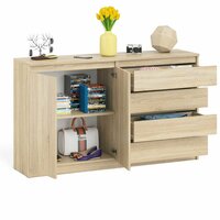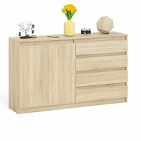 - Широкий комод оборудован четырьмя выдвижными ящиками с одной стороны и закрытым отделением с полкой за двумя распашными дверками. Комод не имеет универсальной сборки - ящики расположены справа.
