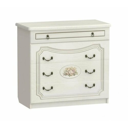 Комод “Верона” – это изысканный и стильный элемент мебели, выполненный в классическом стиле. Он отличается роскошным внешним видом и наличием четырех вместительных ящиков. Фасады ящиков декорированы элегантной фрезеровкой с эффектом патины и медальоном, на котором изображены розы. Для удобства использования ящики оснащены темными металлическими ручками, имитирующими ковку. Для изготовления корпуса комода используется ЛДСП толщиной 16 мм, а фасады выполнены из МДФ с фрезеровкой и фотопечатью. Такая комбинация материалов обеспечивает надежность и долговечность изделия, а также придает ему неповторимый внешний вид.