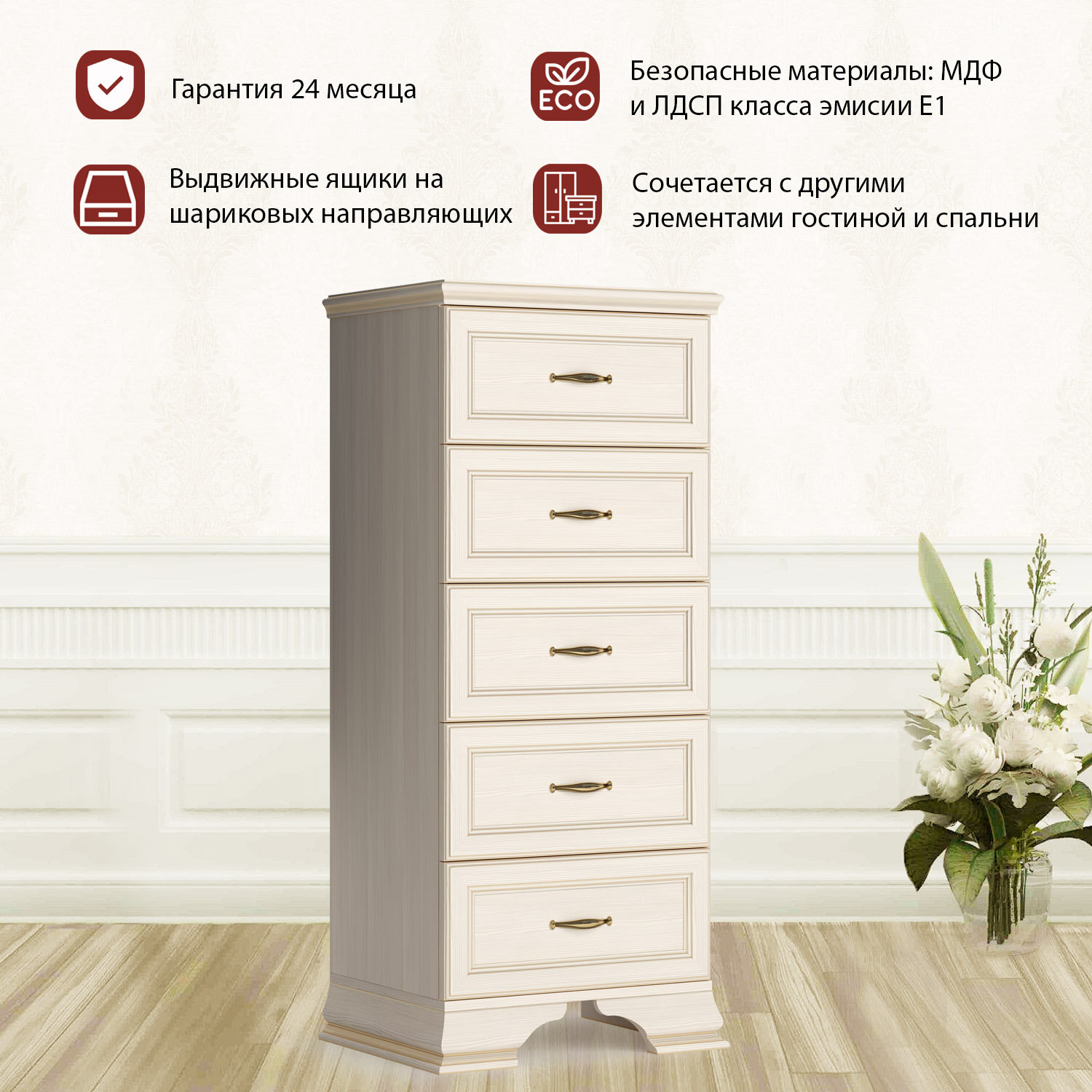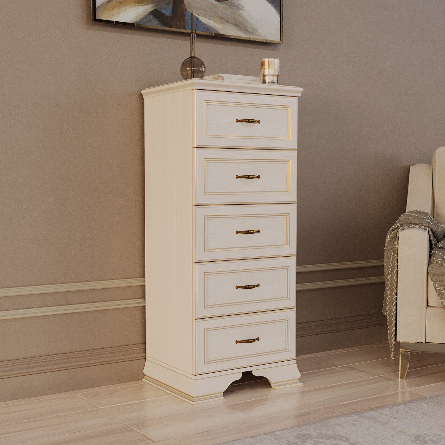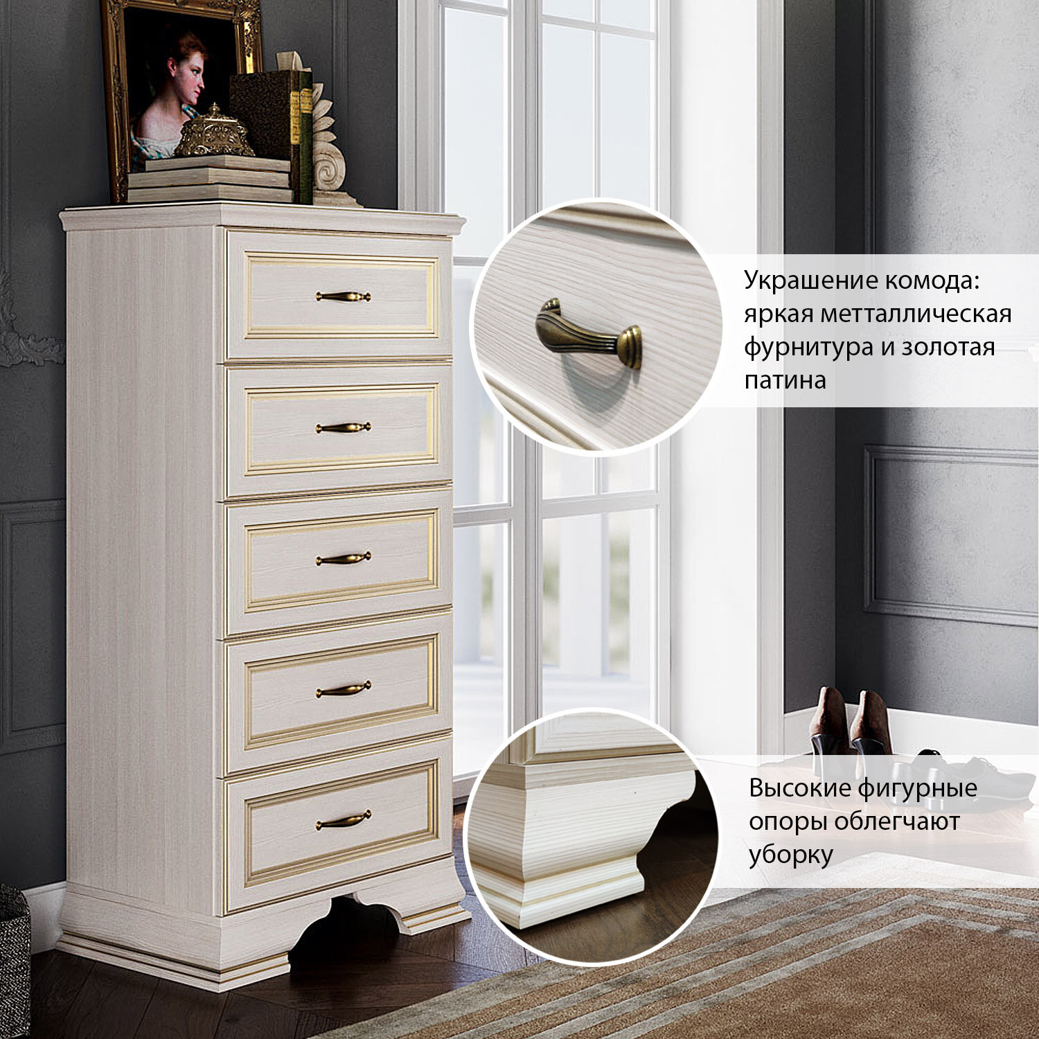 Если вам нужно купить большой комод в современном классическом стиле для гостиной, спальни или прихожей присмотритесь к представленной мебели. В ней вам доступно 5 выдвижных ящиков для хранения всевозможных аксессуаров, белья или постельных принадлежностей. Модуль очень вместителен и функционален.