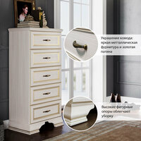 Классический стиль в мебели предполагает надёжную конструкцию с правильными и простыми геометрическими формами, а в качестве декора используются всевозможные элементы, такие как рельефные профили , массивные опоры и изысканная фурнитура . Цветовая гамма ЛДСП и МДФ «Бодега белый» сочетается с благородной золотой патиной и наполняет дом атмосферой тепла уюта. Последний штрих в образе классического комода - это лицевая фурнитура в виде металлических ручек цвета старая бронза.
