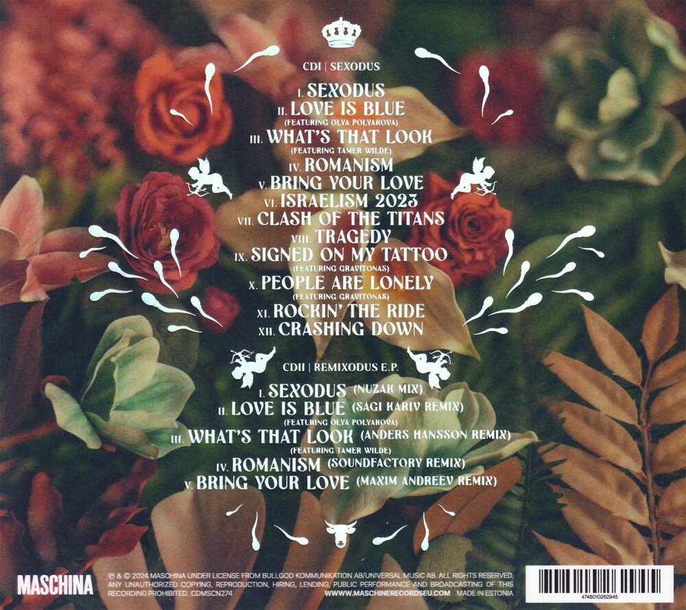 | Треклист | CD1 1 Sexodus 2 Love Is Blue (featuring Olya Polyakova) 3 What’s That Look (featuring Tamer Wilde) 4 Romanism 5 Bring Your Love 6 Israelism 2023 7 Clash Of The Titans 8 Tragedy 9 Signed On My Tattoo 10 People Are Lonely 11 Rockin’ The Ride 12 Crashing Down CD2 1 Sexodus (nuzak mix) 2 Love Is Blue (sagi kariv remix) (featuring Olga Polyakova) 3 What’s That Look (Anders Hansson remix)(featuring Tamer Wilde) 4 Romanism (soundfactory remix) 5 Bring Your Love (Maxim Andreev remix) |