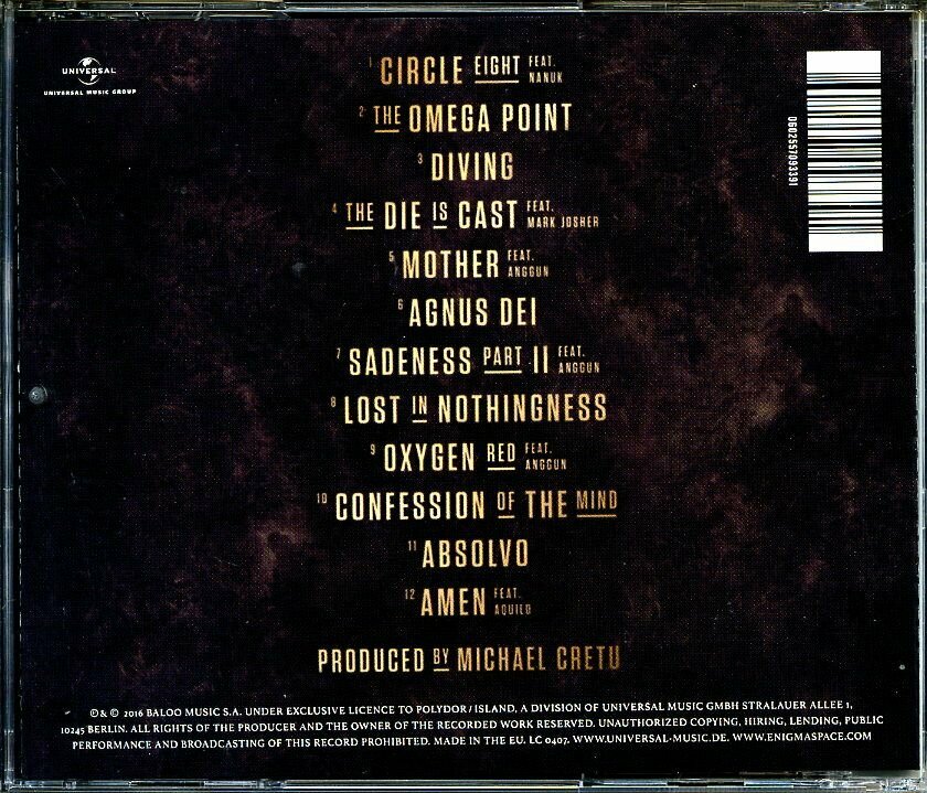 | Треклист | 1. Enigma - Circle Eight 2. Enigma - Omega Point 3. Enigma - Diving 4. Enigma - Die Is Cast 5. Enigma - Mother 6. Enigma - Agnus Dei 7. Enigma - Sadeness, Pt. 2 8. Enigma - Lost in Nothingness 9. Enigma - Oxygen Red 10. Enigma - Confession of the Mind 11. Enigma - Absolvo 12. Enigma - Amen |