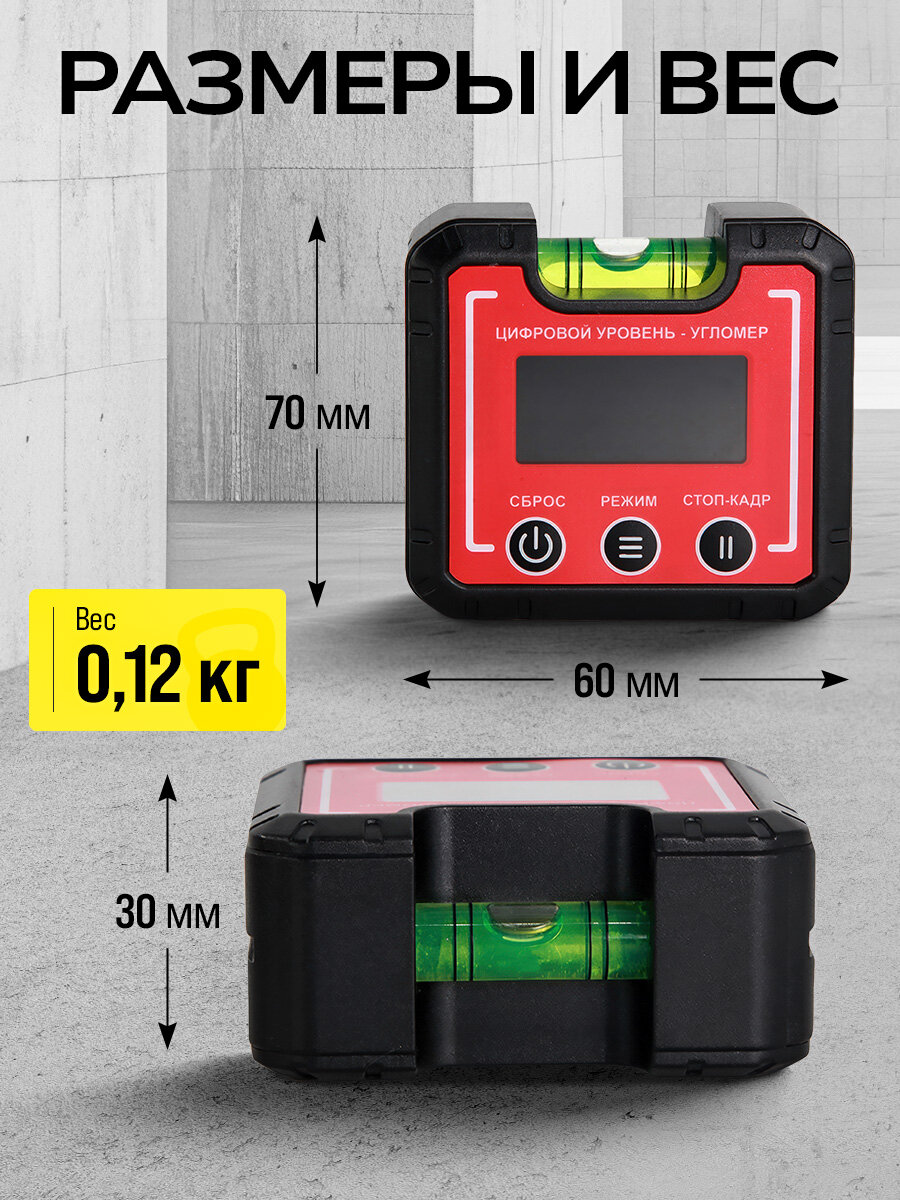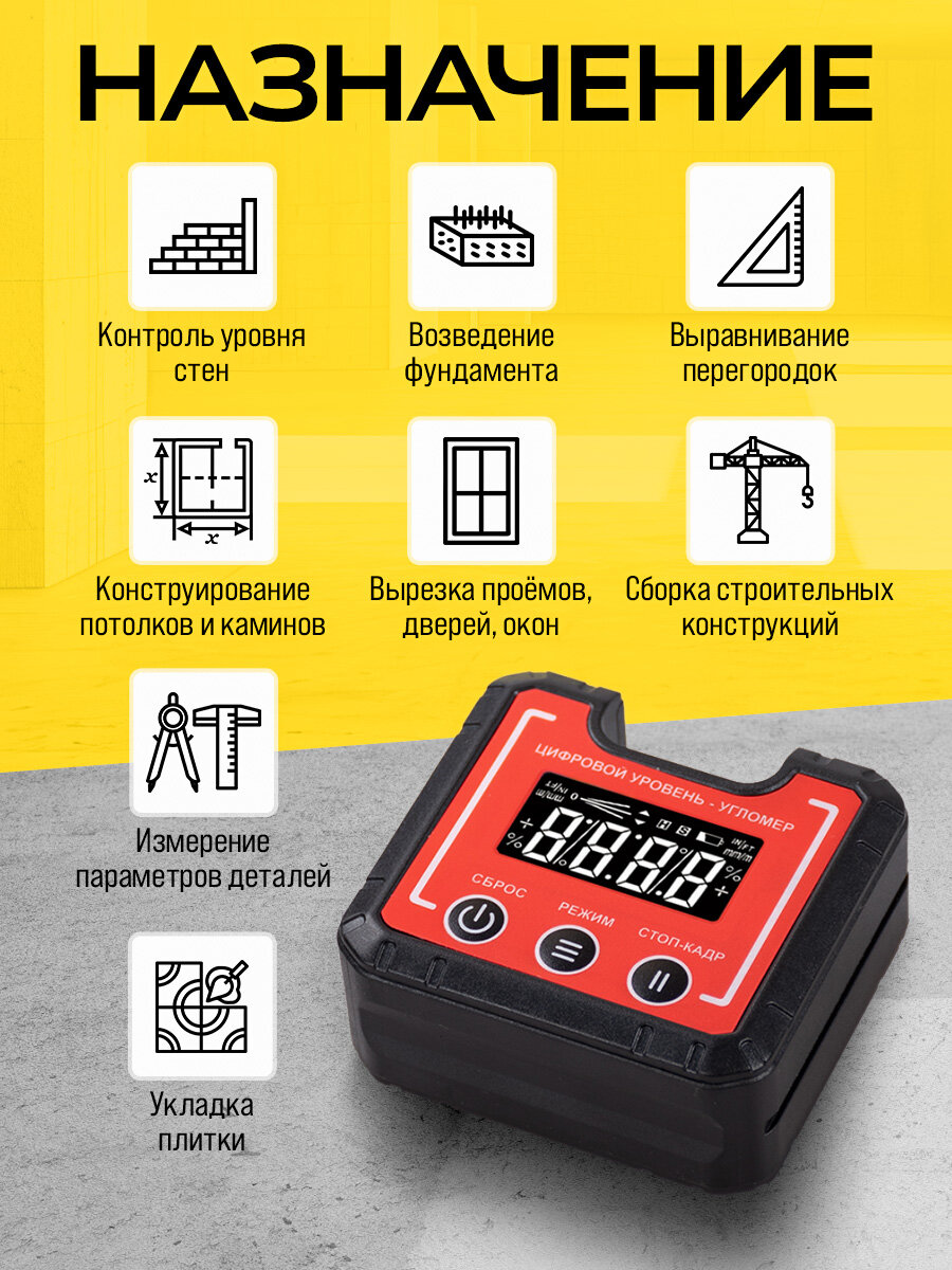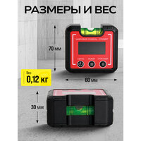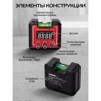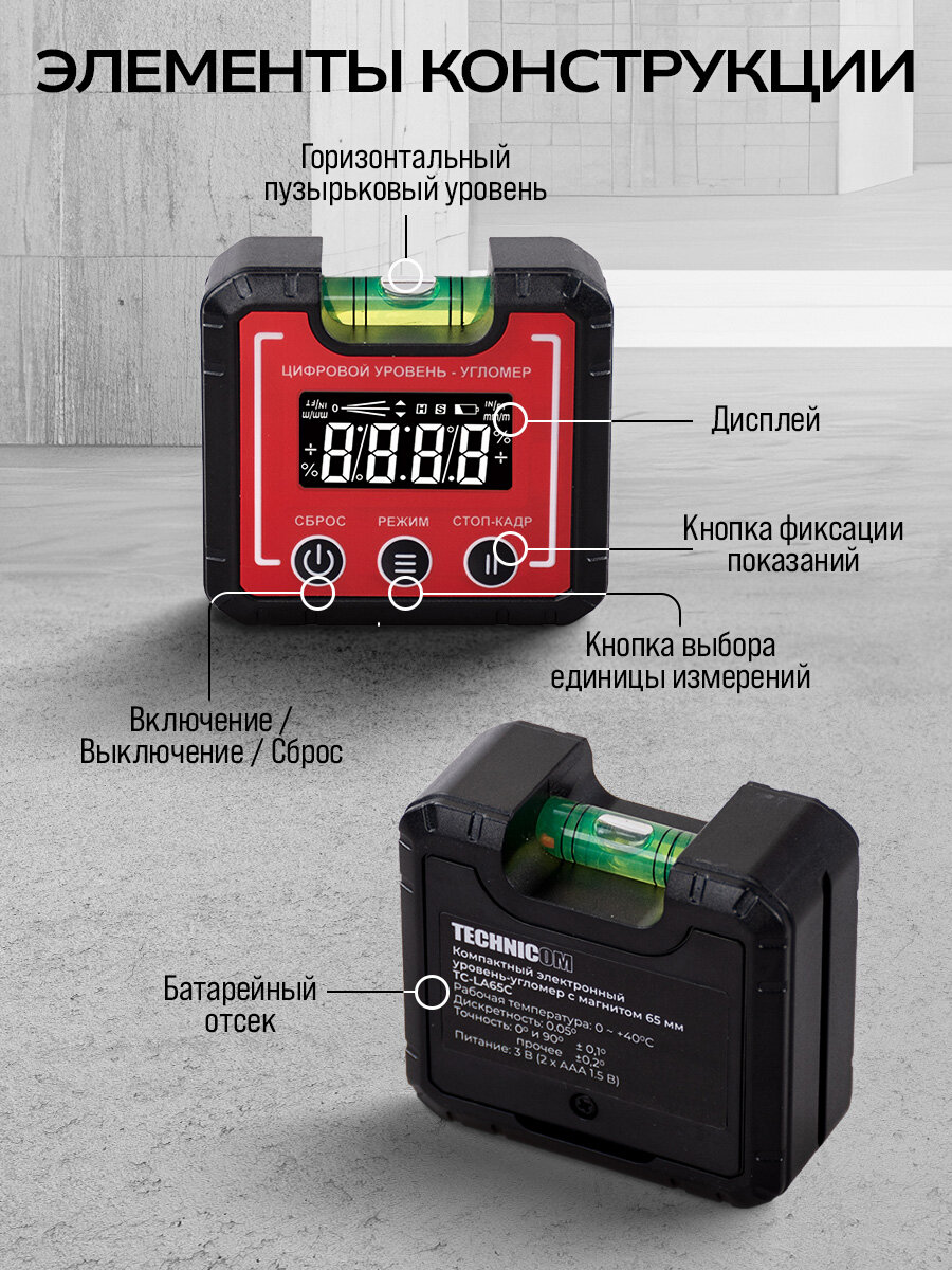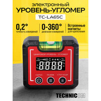 TECHNICOM TC-LA65C – это электронный уровень – угломер, который используется в строительно-монтажных работах для точного измерения и контрольной проверки уровня наклона плоскостей по вертикали и горизонтали при монтаже различных строительных материалов или сборке конструкций. Прибор выполнен в компактном корпусе, имеет встроенное магнитное основание, которое обеспечивает надежное крепление к стальной поверхности. Точность угломера составляет – 0,2°, а диапазон измерений 0-360° На измерительном основании имеется V-образная канавка для легкого крепления к круглым трубам. Преимуществом данной модели является ЖК дисплей с белыми символами и подсветкой, что необходимо в условиях с плохой видимостью. Данный уровень-угломер прост в применении и не требует особых навыков, может применяться как в быту, так и на производстве.