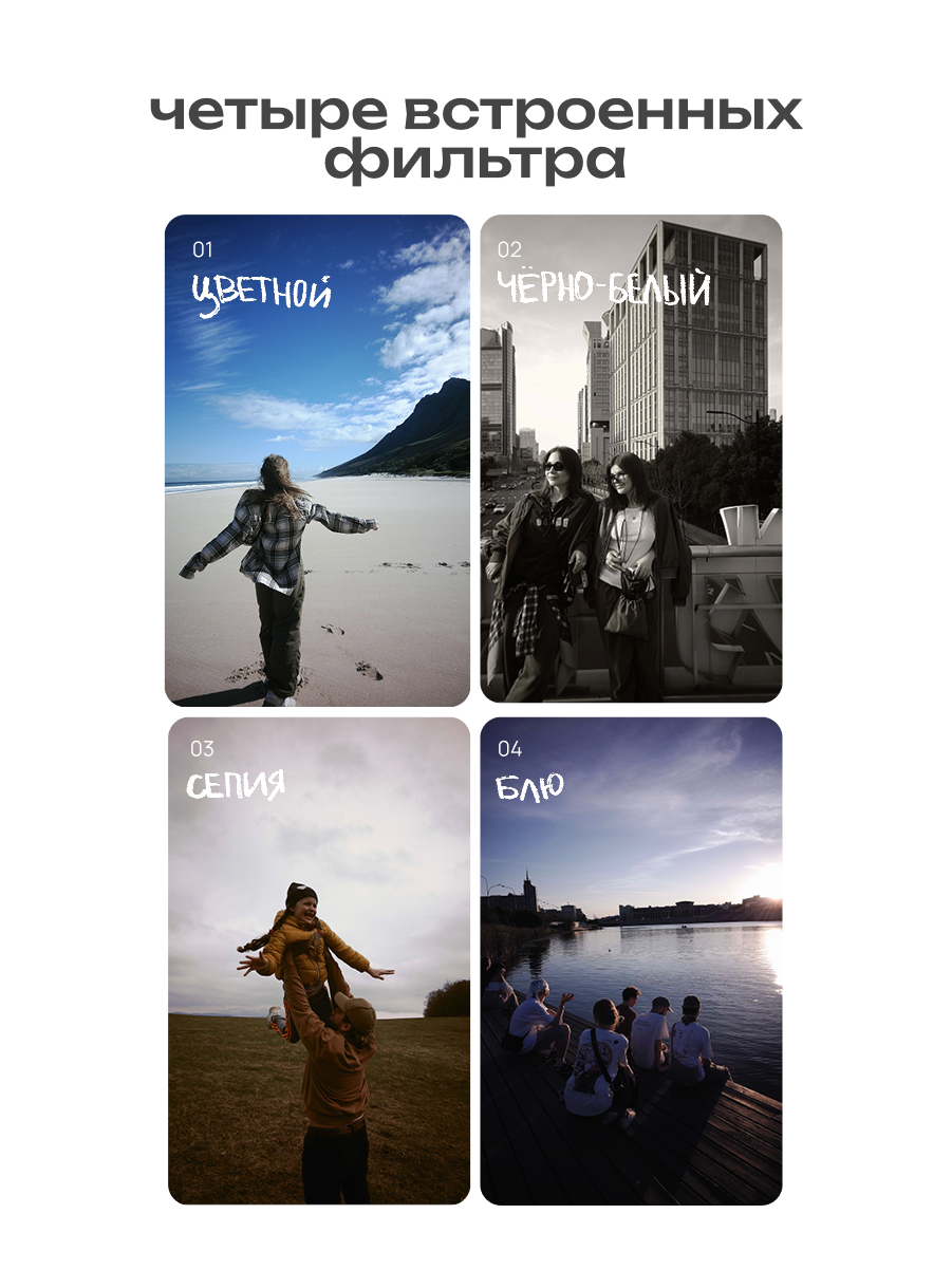 PaperShoot (или «папш») — цифровая камера со встроенными винтажными фильтрами: цвет, ч/б, сепия и блю. Опыт съёмки на папш похож на опыт съёмки на плёночный фотоаппарат, но без хлопот с проявкой — все кадры сохраняются на карту памяти и легко переносятся на ваше устройство через провод Type-C или картридер (не идет в комплекте). К каждому заказу кладем карту памяти на 64GB и аккумуляторы, чтобы вы могли делать фото сразу. Перед началом использования проверьте, всё ли в порядке: сделайте пару пробных кадров, попробуйте перенести их на устройство и если что, пишите нам в поддержку. При желании, вы можете изменить вид камеры: выберите один из 50+ вариантов универсальных кейсов. Все камеры PaperShoot одинаковы внутри и отличаются только внешним видом: - 20 МП разрешение; - Автоэкспозиция; - 4 фильтра (цветной, ч/б, сепия, блю); - Видео и timelapse режимы. Всё, что нужно для съёмки, уже есть в комплекте — ничего докупать не нужно. В упаковке вы найдете: - Материнскую плату камеры; - Кейс из экокожи; - Объективы: макро и широкоугольный; - 2 крепежа (для соединения платы и кейса); - Type-C Type-C кабель (для зарядки и просмотра фото); - SD-карта на 64 ГБ и ААА-батарейки.
