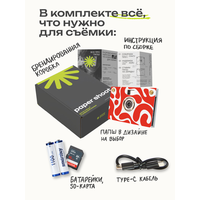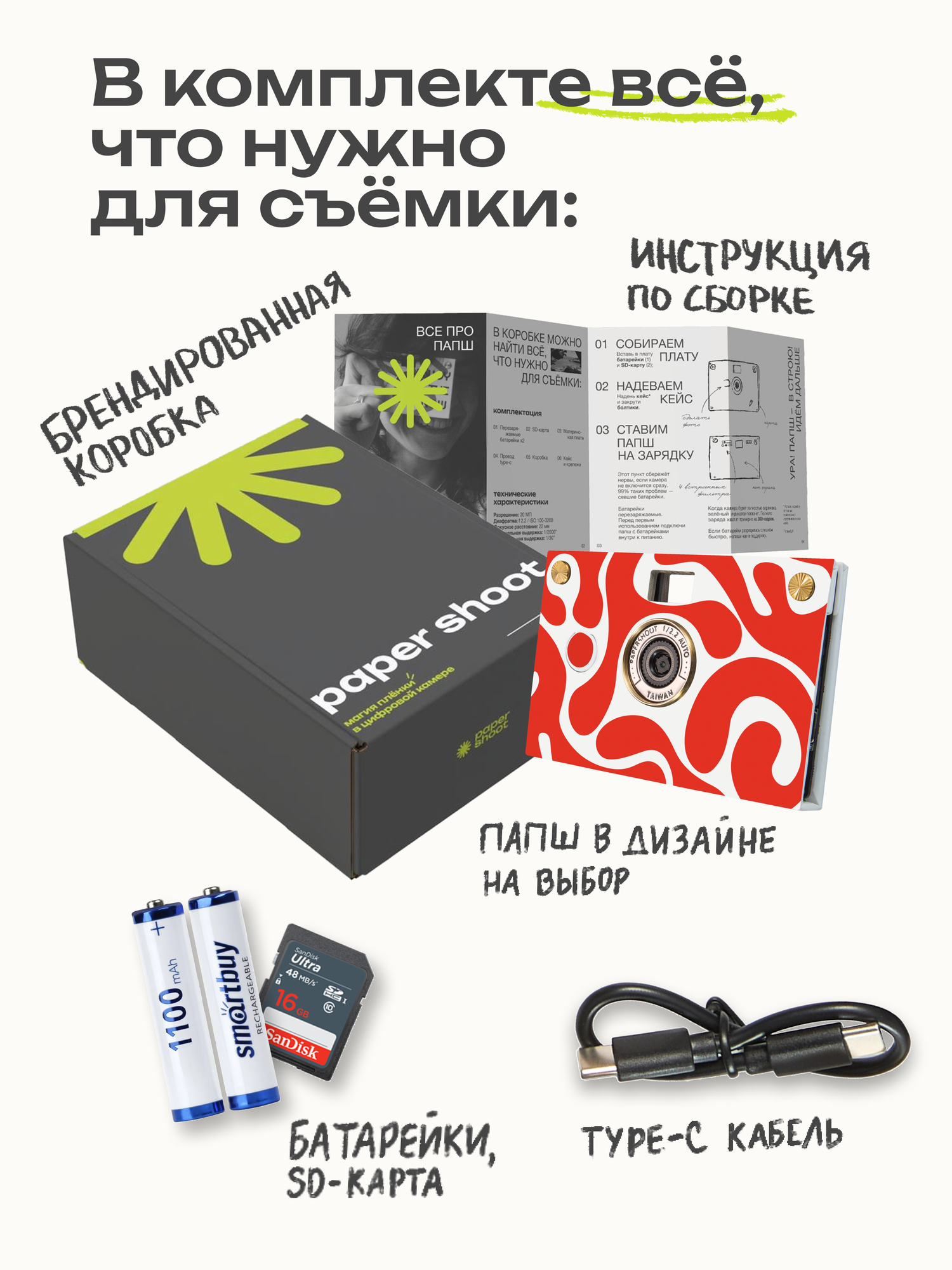| Комплектация | В упаковке вы найдете: Материнскую плату камеры Кейс из каменной бумаги (влаго- и ударо- прочная) 2 крепежа (для соединения платы и кейса) Бумажный ремешок Micro-USB кабель (для зарядки и просмотра фото) SD-карта на 8 ГБ и ААА-батарейки |