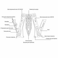 | Инструменты (функции) | винтовая отвёртка, гаечный ключ, игла, карабин, клипса, консервный нож, крючок, кусачки, линейка, напильник, нож, ножницы, огниво, отвертка, открывалка для бутылок, пассатижи, пила, пилка для ногтей, плоскогубцы, сменные биты, стеклобой, шило / кернер, штопор |