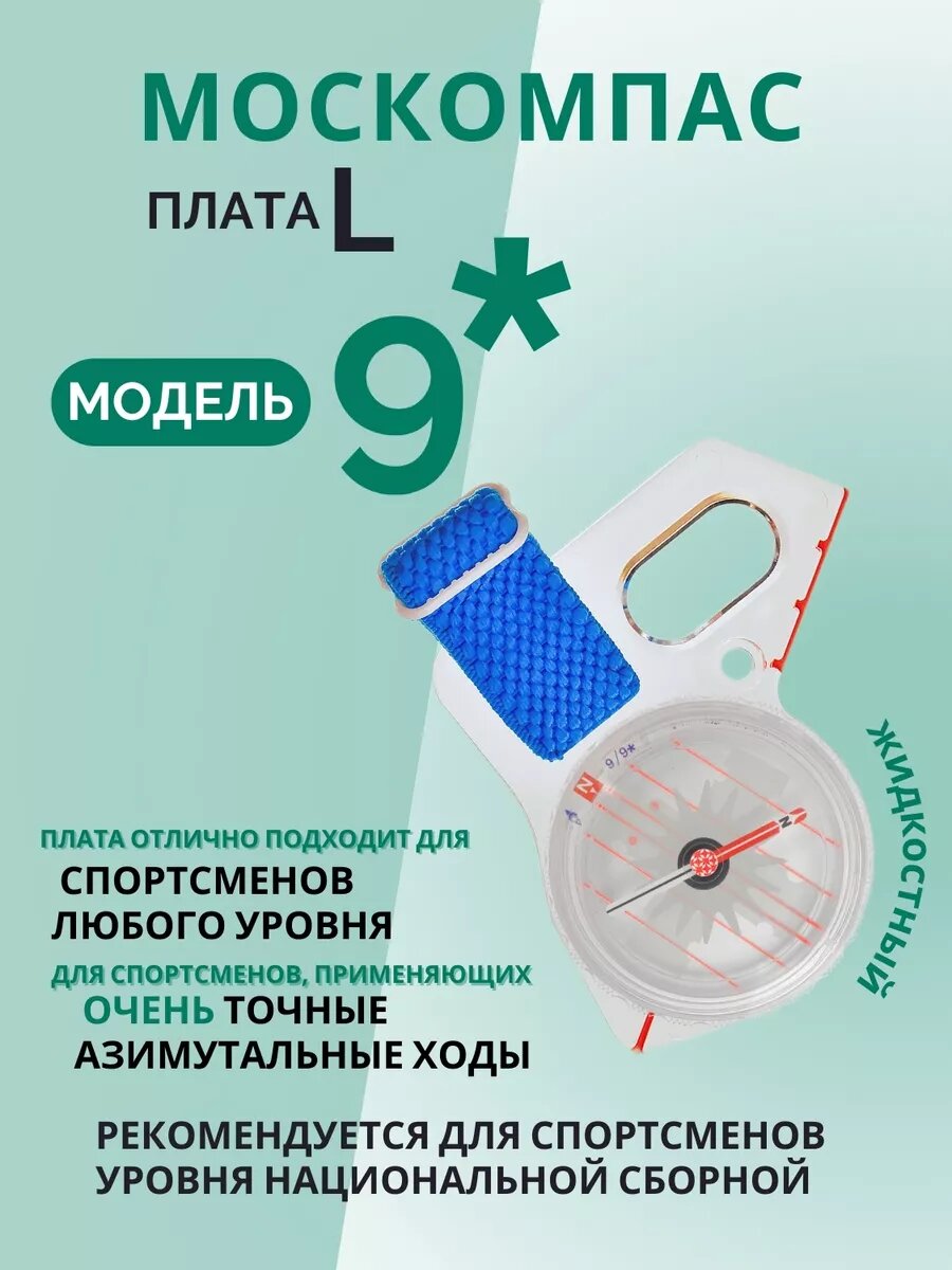 Москомпас модель 9* предназначена для спортсменов, предпочитающих стиль быстрого ориентирования. Это самый быстрый компас. От модели 9 отличается еще большей стабильностью, обусловленной конструкцией стабилизирующего круга. Наиболее популярная модель у элитных спортсменов, использующих азимутальные ходы. Плато L предназначено под большой палец левой руки. Специальный ремешок для крепления надежно фиксирует компас на пальце. Конструкция этой модели позволяет легко сверять направление бега по карте. На плате предусмотрено отверстие для крепления лупы, с которой намного удобнее читать карту.